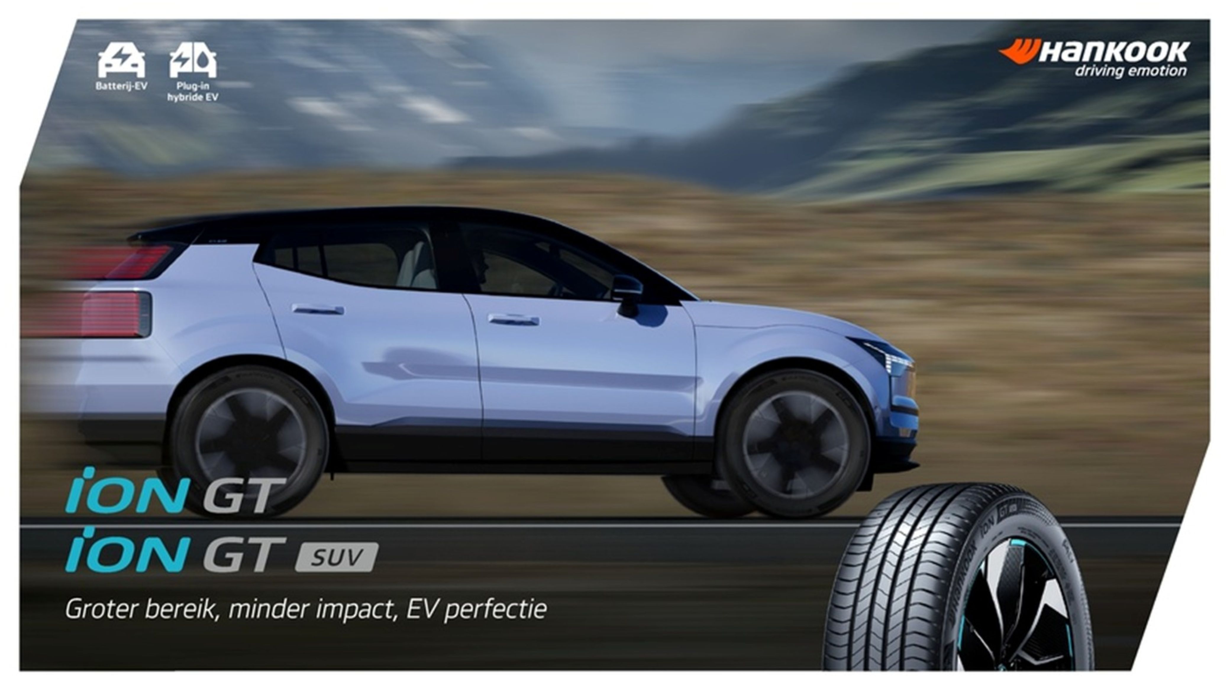 ยางรุ่น iON GT SUV ในกลุ่มผลิตภัณฑ์ยาง iON ของฮันกุก ไทร์ ผสมผสานทั้งความปลอดภัยขั้นสูงสุด ระยะเวลาการใช้งานที่ยาวนาน และประสิทธิภาพที่เหนือขั้นสำหรับผู้ขับขี่ที่ใส่ใจสิ่งแวดล้อม ยางรุ่นนี้จึงมอบประสบการณ์การขับขี่ที่นุ่มนวลและเงียบยิ่งขึ้น สำหรับรถอเนกประสงค์ (SUV) พลังงานไฟฟ้าโดยเฉพาะ ด้วยการยึดเกาะถนนที่ยอดเยี่ยม ความมั่นคง และเทคโนโลยี iSound Absorber™ ของฮันกุก ไทร์