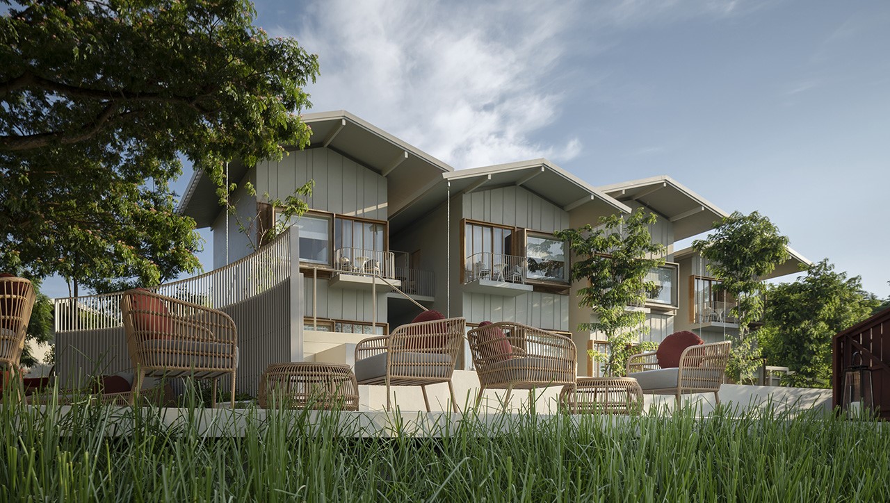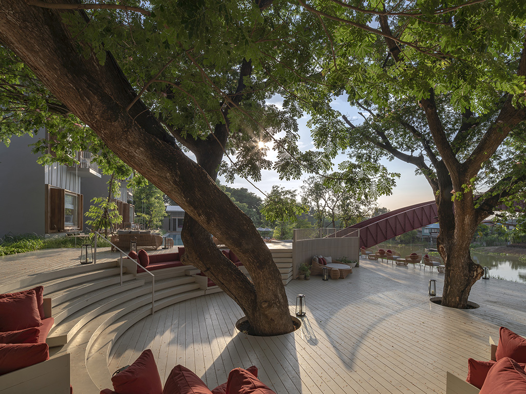 ผ่อนคลาย และเป็นกันเอง โดยตัวอาคารได้รับการออกแบบให้มีขนาดสอดคล้องกับบ้านเรือนโดยรอบ โอบล้อมด้วยต้นไม้เขียวขจี และต้นจามจุรีสูงใหญ่ที่ได้รับการอนุรักษ์ไว้เป็นอย่างดี ควบคู่กับการมอบความสะดวกสบายและฟังก์ชันการใช้งานที่ทันสมัยครบครัน แขกที่มาเยือนจะได้รับการต้อนรับบริเวณพื้นที่ล็อบบี้ที่โปร่งสบาย แต่งแต้มด้วยสีแดงอันสดใส ใต้อาคารไม้ยกพื้นสูง พร้อมด้วยแลนด์มาร์กสำคัญที่กลายเป็นสัญลักษณ์ประจำบูติกรีสอร์ทแห่งนี้ คือสะพานสีแดงทอดข้ามแม่น้ำ ที่มีสีสันโดดเด่น แต่ก็กลมกลืนไปกับบริบทของหมู่บ้าน ทำหน้าที่เชื่อมพื้นที่สองฝั่ง และแฝงถึงการเชื่อมโยงระหว่างสถาปัตยกรรมสมัยใหม่กับวิถีชุมชนท้องถิ่นริมฝั่งน้ำได้เป็นอย่างดี