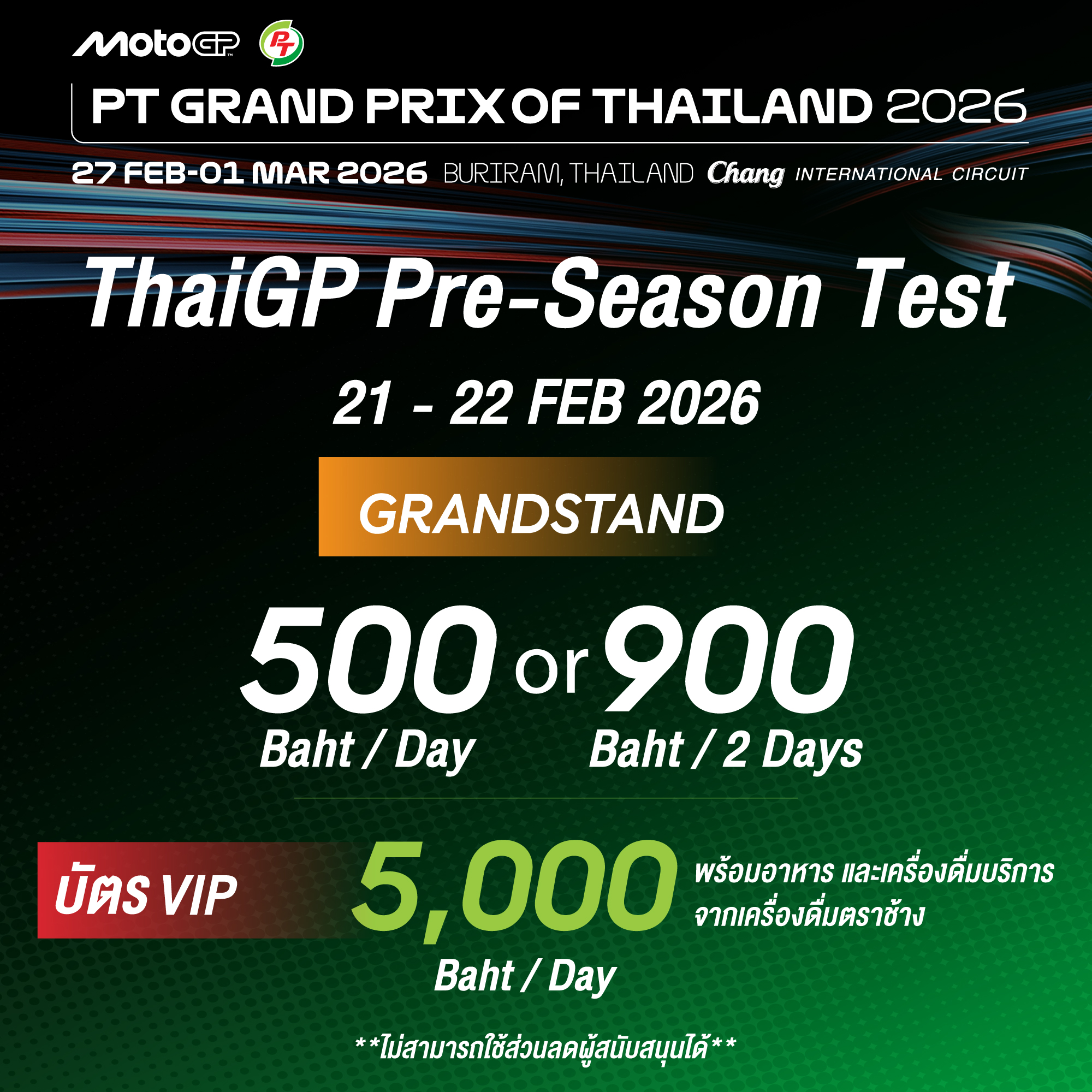 5. บัตรชม Pre-Season Test (ซื้อแยก) ชมการทดสอบก่อนเปิดฤดูกาลที่จังหวัดบุรีรัมย์ วันที่ 21-22 กุมภาพันธ์ 2569 ราคาจำหน่ายบัตร แบ่งเป็น บัตร Grand Stand ราคา 500 บาทต่อวัน หรือเหมา 2 วัน 900 บาท, บัตร VIP 5,000 บาท ต่อวัน