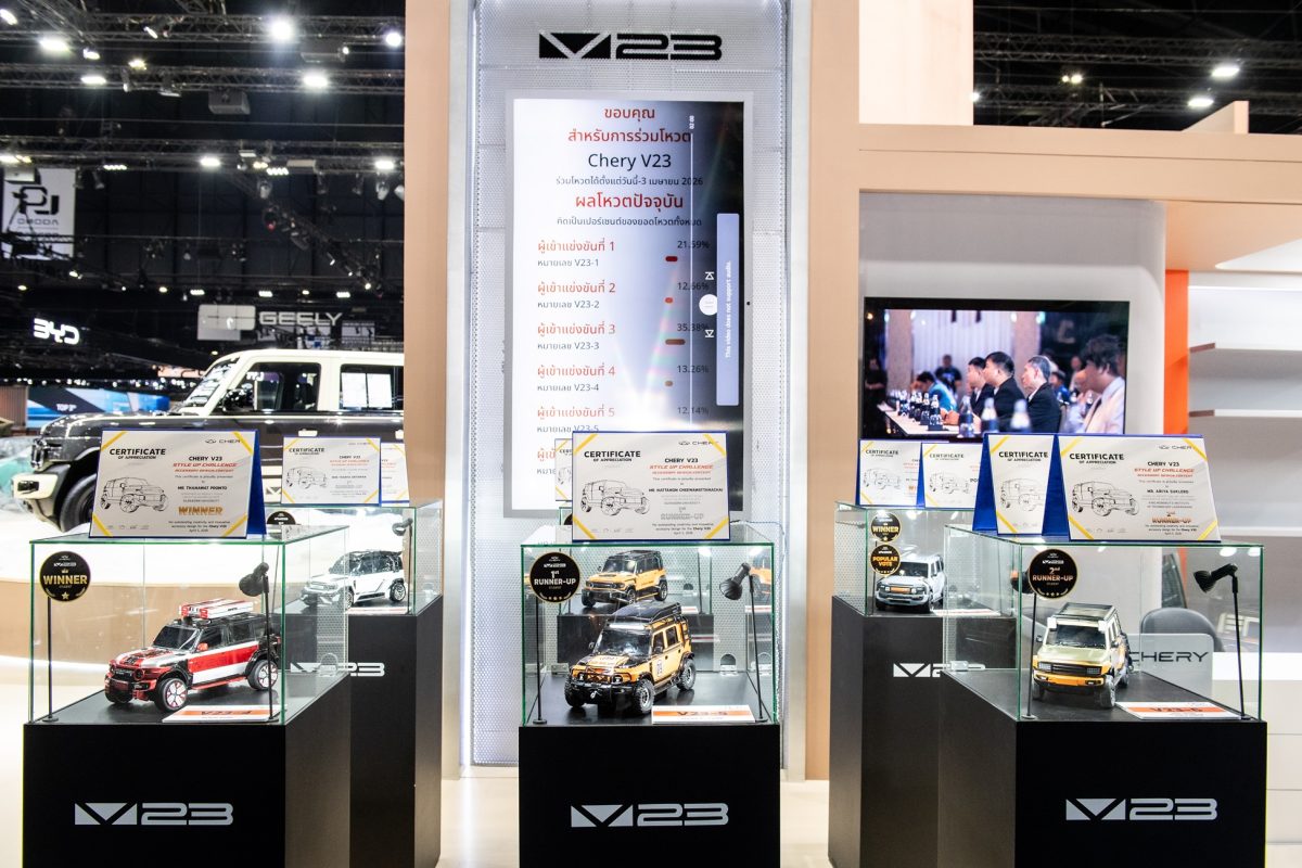 เชอรี ประเทศไทย ร่วมกับ สมาคมวิศวกรรมยานยนต์ไทย บริษัท กรังด์ปรีซ์ อินเตอร์เนชั่นแนล จำกัด (มหาชน) และสมาคมผู้สื่อข่าวรถยนต์และรถจักรยานยนต์ไทย(สรยท.) จัดพิธีมอบรางวัลโครงการประกวดออกแบบอุปกรณ์ตกแต่งรถยนต์ “Chery V23 Style Up Challenge” อย่างเป็นทางการ ณ บูธรถยนต์ CHERY ภายในงาน บางกอก อินเตอร์เนชั่นแนล มอเตอร์โชว์ ครั้งที่ 47 อาคารชาเลนเจอร์ 1–3 อิมแพ็ค เมืองทองธานี เมื่อวันที่ 5 เมษายน 2569 ท่ามกลางบรรยากาศคึกคัก โดยมีผู้บริหาร พันธมิตรในอุตสาหกรรม และสื่อมวลชนร่วมเป็นสักขีพยาน