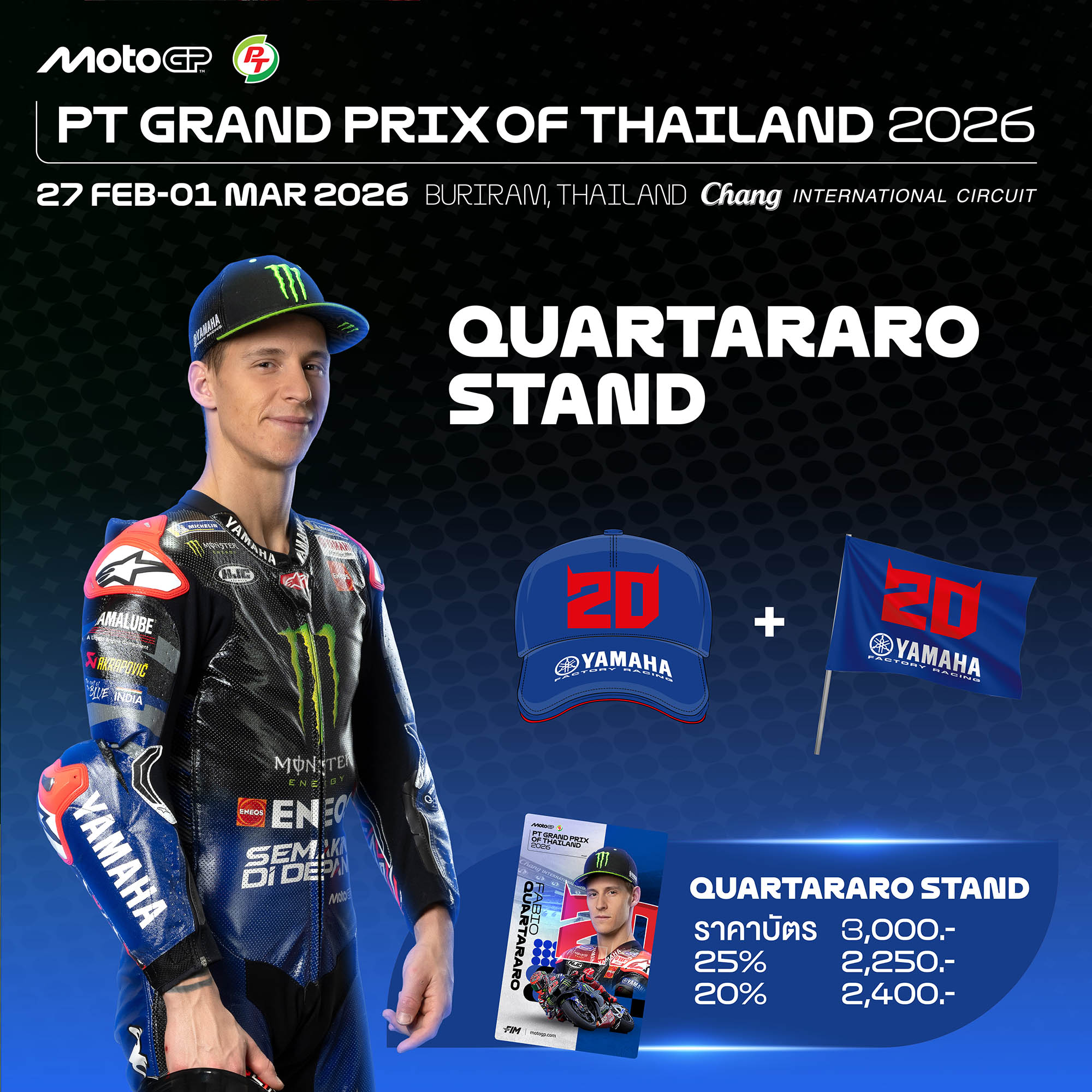 แฟนความเร็ว สามารถจับจองที่นั่งในอัฒจันทร์นักบิดที่ชื่นชอบ ในราคาบัตรเพียง 3,000 บาท ใช้ร่วมกับส่วนลด 25% เหลือ 2,250 บาท หรือใช้ร่วมกับส่วนลด 20% เหลือ 2,400 บาท พร้อมรับของที่ระลึกลิขสิทธิ์แท้ คุ้มค่าทั้งประสบการณ์และของสะสมจากหน้าประวัติศาสตร์โมโตจีพี สนามเปิดฤดูกาล 2026