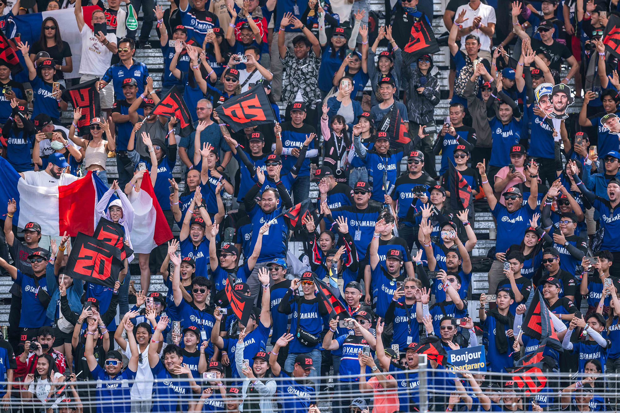 2.Quartararo Stand สำหรับกองเชียร์ “ฟาบิโอ กวาร์ตาราโร” แชมป์โลกชาวฝรั่งเศส หมายเลข 20 ขวัญใจแฟนยามาฮ่าทั่วโลก มาพร้อมหมวกและธงเชียร์โทนสีน้ำเงินเข้ม สื่อถึงความเร็ว ความเฉียบคม และจิตวิญญาณนักสู้เจ้าของฉายา “El Diablo” (ปีศาจ)