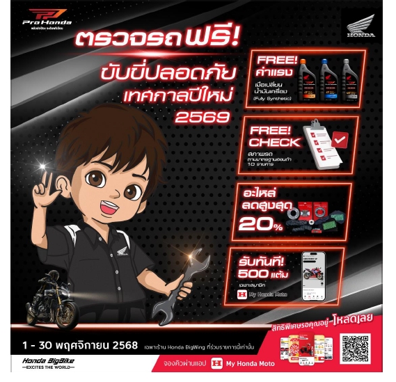 ฮอนด้าบิ๊กไบค์ ชวนผู้ใช้รถตรวจรถฟรีถึง 10 รายการ ขับขี่ปลอดภัย รับเทศกาลปีใหม่ 2569 ตั้งแต่วันที่ 1 – 30 พฤศจิกายน 2568