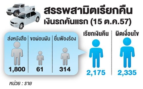กรมสรรพสามิตแจงผลพวงโครงการรถคันแรก "เรียกเงินคืน-ผิดเงื่อนไขโครงการ" 4.5 พันราย ยื่นฟ้องร้องกว่า 300 ราย ประธานสมาคมเช่าซื้อรับตลาดเช่าซื้อไม่ดี พร้อมคุมเข้มให้สินเชื่อ เผยรถยึดค้างสต็อก 1.4 หมื่นคัน หวังตลาดรถปีหน้าฟื้นจากแรงกระตุ้นเศรษฐกิจของรัฐ สถาบันการเงินหันเช่าพื้นที่เปิดประมูลรถยึด