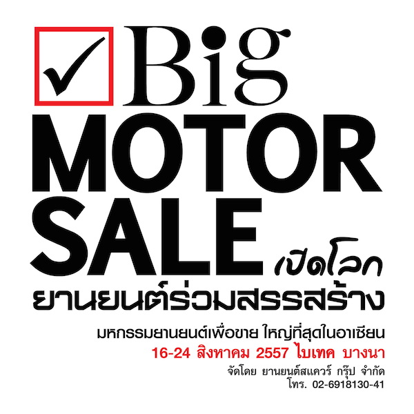 เปิดฉากแล้ว มหกรรมยานยนต์ เพื่อขายใหญ่ที่สุดในอาเซียน Big Motor Sale 2014 จัดขึ้นระหว่างวันที่ 16-24 สิงหาคมนี้ ณ ศูนย์นิทรรศการและการประชุมไบเทค บางนา ผู้จัดสุดมั่นกระตุ้นเศรษฐกิจ และดันยอดตลาดรถพุ่ง จากการอัดแคมเปญแรงๆของค่ายรถยนต์