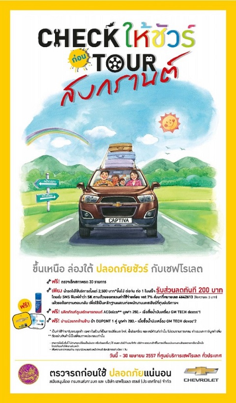 เจ้าของรถยนต์ เชฟโรเลต ที่มีแผนการเดินทางท่องเที่ยวช่วงวันหยุดยาวเทศกาลสงกรานต์ สามารถเข้ารับการตรวจเช็คความพร้อมของรถโดยไม่เสียค่าใช้จ่าย เพื่อเพิ่มความปลอดภัยก่อนออกเดินทางช่วงเทศกาลที่มีการจราจรหนาแน่นและสภาพอากาศที่ร้อนตลอดทั้งเดือนเมษายนนี้