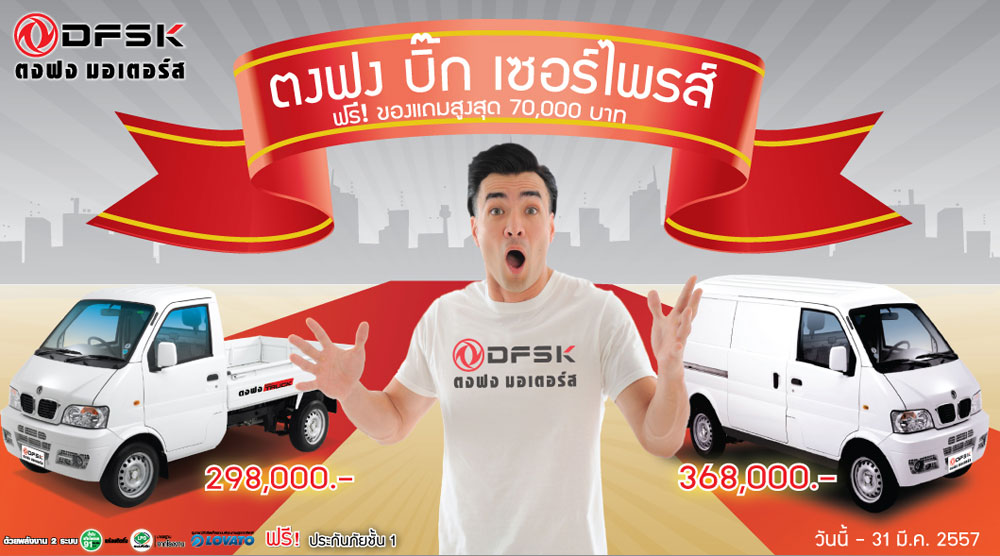 ตงฟง มอเตอร์ส ผู้นำตลาดรถกระบะเล็กจากจีน จัดแคมเปญพิเศษต้อนรับปีม้า 2557 ตงฟง บิ๊กเซอร์ไพรส์ ฟรีของแถมมูลค่าสูงสุดถึง 70,000 บาท ตั้งแต่วันนี้ - 31 มีนาคม 2557 ที่ผู้แทนจำหน่าย ตงฟง ทั่วประเทศ