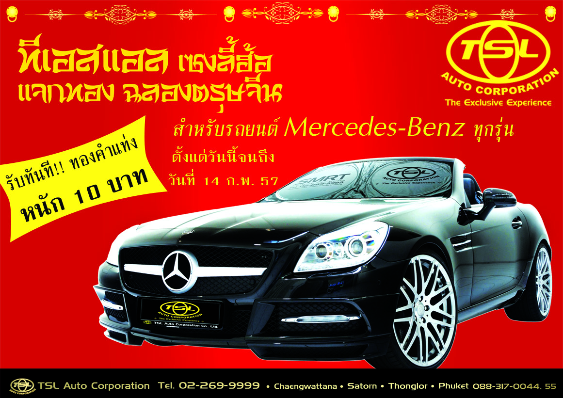 บริษัท ทีเอสแอล ออโต้ คอร์ปอเรชั่น จำกัด ผู้นำเข้าและจัดจำหน่ายยนตรกรรมชั้นนำจากต่างประเทศแบบครบวงจร นำโดย นายดำรงค์ นิลรังษี ผู้อำนวยการฝ่ายขาย ยกขบวนรถยนต์ Mercedes-Benz ร่วมเฉลิมฉลองเทศกาลตรุษจีน พร้อมโปรโมชั่นสุดอลังการแห่งปี “ทีเอสแอล เซงลี้ฮ้อ แจกทอง ฉลองตรุษจีน” พิเศษสำหรับลูกค้าทุกท่านที่ซื้อรถยนต์ Mercedes-Benz ทุกรุ