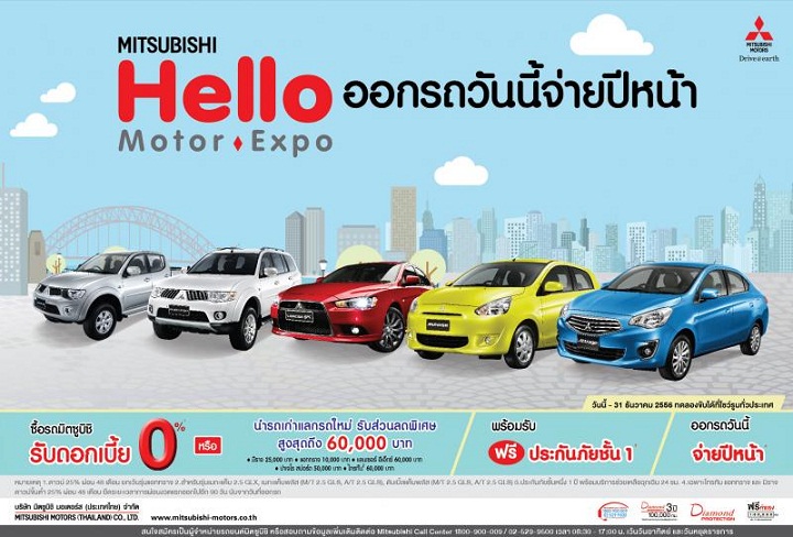 มิตซูบิชิ มอเตอร์ส ประเทศไทย เปิดแคมเปญแรงต้อนรับงาน Motor Expo ก่อนใคร พิเศษสำหรับลูกค้ามิตซูบิชิ รับดอกเบี้ย 0% หรือนำรถเก่ามาแลกรถใหม่เพิ่มมูลค่าสูงสุด 60,000 บาท พร้อมรับโปรโมชั่นออกรถวันนี้จ่ายปีหน้า แถมฟรีไดมอนด์ โปรเทคชั่น ประกันภัยชั้นหนึ่ง และบริการช่วยเหลือฉุกเฉิน 1 ปี พร้อมรับข้อเสนอพิเศษอีกมากมาย เริ่มแล้