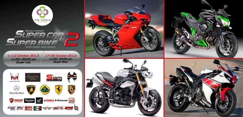 งาน Super Car & Super Bike Supercharge Your Commute ครั้งที่ 2 วันที่ 17-20 ตุลาคม 2556 พบกับ Super Bike ณ ศูนย์การค้า “เดอะ เซอร์เคิล ราชพฤกษ์” พบกับ Super Bike แบรนด์ดังอาทิเช่น Ducati, Triumph, Kawasaki, Yamaha, Honda และบู๊ธจำหน่ายสินค้า และอุปกรณ์ตกแต่งราคาพิเศษ ในงานนี้คนรัก Super Bike พลาดไม่ได้กับการรวมตัวกันของคลับต่างๆ ของ Super Bike นับร้อยคัน ในวันที่ 19-20 ตุลาคม 2556
