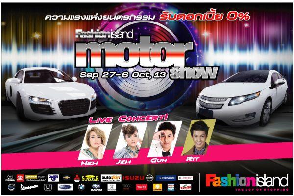 ศูนย์การค้าแฟชั่นไอส์แลนด์ จัดงาน “MOTOR SHOW 2013” ระหว่างวันที่ 27 กันยายน – 6 ตุลาคม 2556 เติมความสนุกให้ทุกการขับขี่ ด้วยคอนเซ็ปต์ Auto Entertainment เน้นระดมรถยนต์คุณภาพจากทุกค่ายรถแบรนด์ดัง ทั้งเมอร์เซเดส-เบนซ์, บีเอ็มดับเบิลยู, วอลโว่, โตโยต้า, ฮอนด้า, นิสสัน, มิตซูบิชิ, เชฟโรเลต, เลกซัส, ฟอร์ด, ซีตรอง, เปอโยต์, อีซูซุ และรถซุปเปอร์คาร์