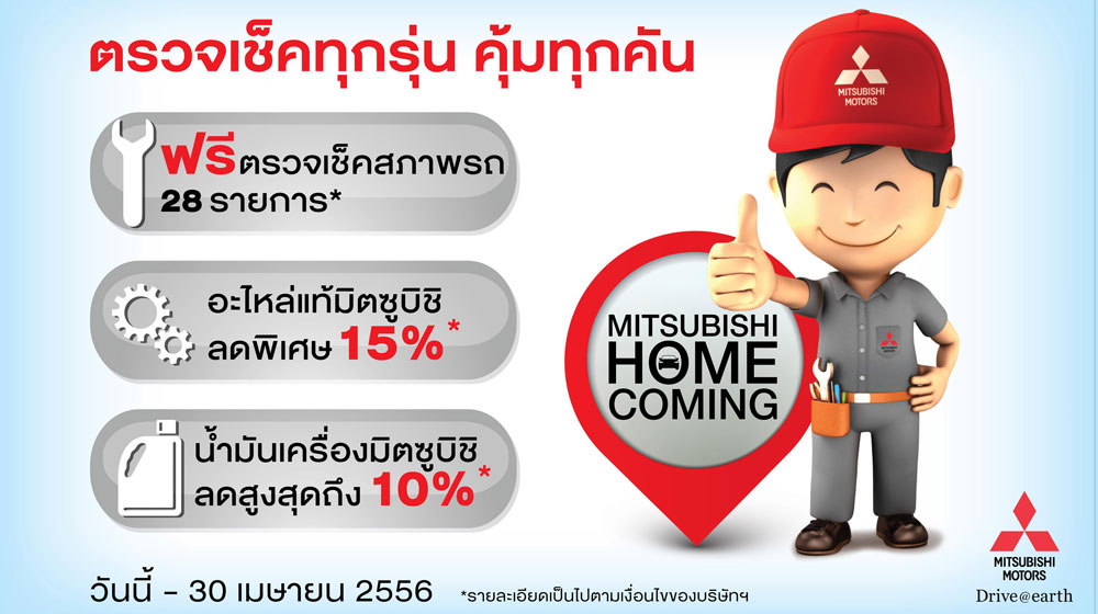 มิตซูบิชิ จัดแคมเปญรับเดือนเมษายน Mitsubishi Home Coming ต้อนรับมิตซูบิชิ ทุกรุ่นกลับบ้าน ด้วยแพคเกจและข้อเสนอสุดคุ้ม ฟรี ตรวจสภาพรถยนต์ 28 รายการ อะไหล่แท้มิตซูบิชิ ลดพิเศษ 15% น้ำมันเครื่องมิตซูบิชิ ลดสูงสุด 10% ตั้งแต่วันนี้ถึง 30 เมษายน 2556 นี้ ที่ศูนย์บริการรถยนต์มิตซูบิชิทั่วประเทศ