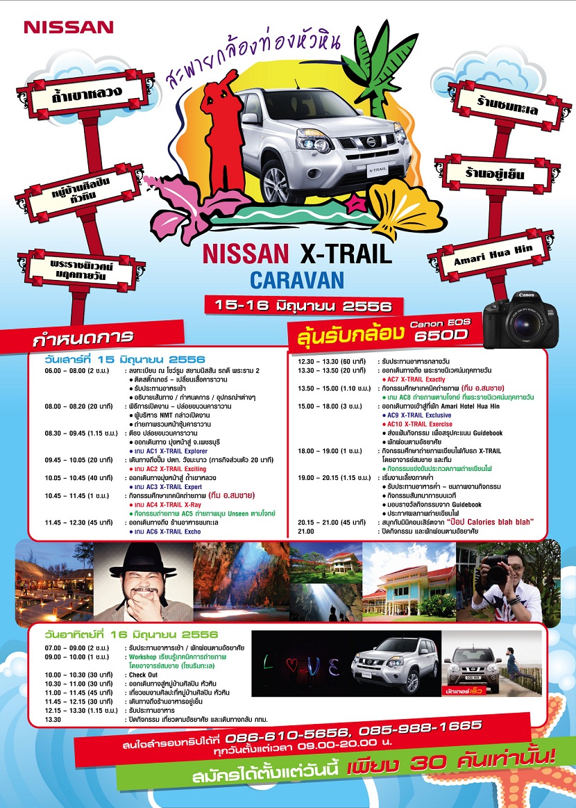 บริษัท นิสสัน มอเตอร์ (ประเทศไทย) จำกัด จัดกิจกรรมคาราวานท่องเที่ยวเชิญชวนลูกค้านิสสัน เอ็กซ์เทรลทุกรุ่น เข้าร่วมกิจกรรมคาราวานภายใต้ชื่อ “สะพายกล้องท่องหัวหิน” ที่จะจัดขึ้นในวันที่ 15-16 มิถุนายน 2556 เส้นทางกรุงเทพ – หัวหิน ระยะทางรวมกว่า 300 กิโลเมตร