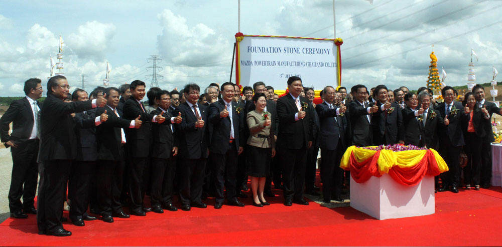 มาสด้า มอเตอร์ คอร์ปอเรชั่น จัดพิธีวางศิลาฤกษ์โครงการก่อสร้างโรงงานผลิตเกียร์อัตโนมัติแห่งใหม่ขึ้นในประเทศไทย ที่จังหวัดชลบุรี ภายใต้ชื่ออย่างเป็นทางการ Mazda Powertrain Manufacturing (Thailand) Co., Ltd. หรือ MPMT โดยมีคณะผู้บริหาร, พนักงาน และแขกผู้มีเกียรติร่วมงานประมาณ 50 คน ซึ่งได้รับเกียรติอย่างสูงจากที่ปรึกษาด้านการลงทุน สำนักงานคณะกรรมการส่งเสริมการลงทุน (BOI) นางสาวอัจฉรินทร์ พัฒนพันธ์ชัย, ผู้ว่าการนิคมอุตสาหกรรมแห่งประเทศไทย นายวีรพงศ์ ไชยเพิ่ม และ มร. มิตซูโยชิ นากามูระ ประธานกรรมการ บริษัท คาจิมา คอร์ปอเรชั่น, มร. เซอิตะ คานาอิ เจ้าหน้าที่ผู้บริหารระดับสูง รองประธานคณะกรรมการบอร์ดบริหาร และ มร. ฮิเดโนริ คาวากามิ ประธานกรรมการโรงงานมาสด้าแห่งใหม่ มร. เซอิตะ คานาอิ เจ้าหน้าที่บริหารระดับสูง และรองประธานคณะกรรมการบริหาร มาสด้า มอเตอร์ คอร์ปอเรชั่น กล่าวถึงโรงงานแห่งใหม่ว่า "เทคโนโลยี SkyActiv ของมาสด้าในขณะนี้ กำลังได้รับความสนใจและยอมรับอย่างมากทั่วโลก การสร้างโรงงานผลิตเกียร์อัตโนมัติ MPMT ในประเทศไทยขึ้นเป็นแห่งที่ 2 ของมาสด้า จะช่วยเพิ่มกำลังการผลิตของเทคโนโลยี SkyActiv และช่วยให้มาสด้า สามารถตอบสนองความต้องการของลูกค้าที่มีเพิ่มมากขึ้นในอนาคตได้อย่างดี นอกจากจะกลายเป็นส่วนสำคัญที่จะนำการเติบโตมาสู่มาสด้าแล้ว โรงงานแห่งนี้ยังเป็นส่วนสำคัญ ในการพัฒนาอุตสาหกรรมยานยนต์ของไทยให้รุดหน้ายิ่งขึ้น"