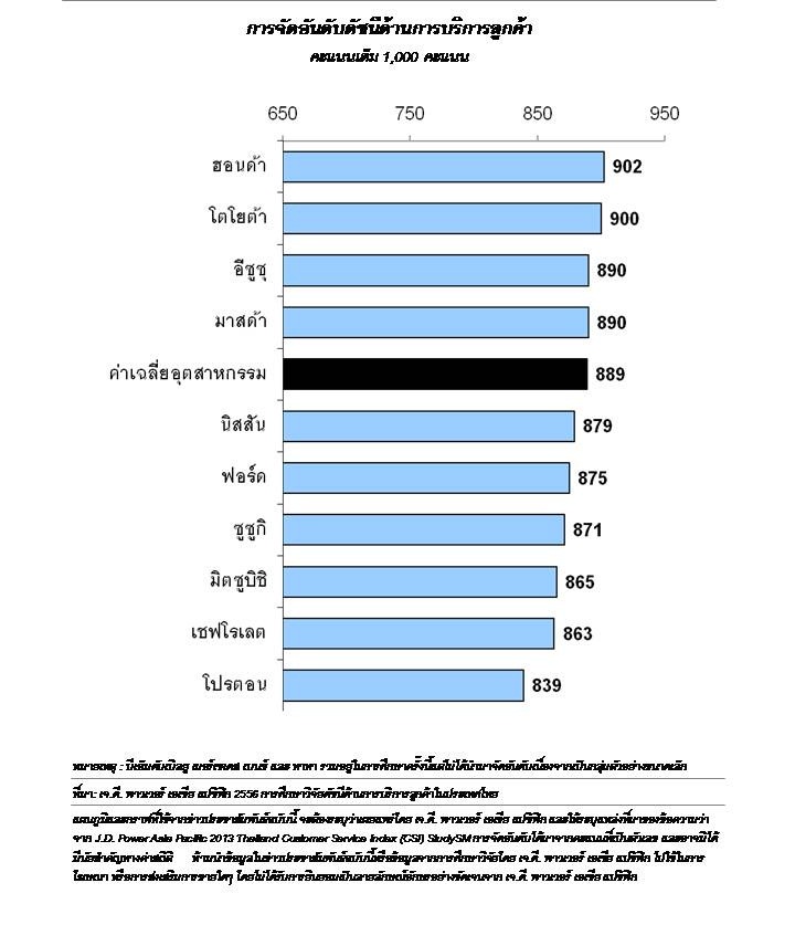 จากการศึกษาวิจัยรถยนต์ 10 ยี่ห้อในครั้งนี้ นับเป็นครั้งแรกในการทำการศึกษาวิจัยตั้งแต่ปี 2543 ที่ฮอนด้าได้ครองอันดับหนึ่งด้านความพึงพอใจการบริการหลังการขาย ด้วยคะแนนความพึงพอใจโดยรวม 902 คะแนน ฮอนด้าให้บริการหลังการขายได้เป็นอย่างดี โดยเฉพาะด้านการเริ่มต้นให้บริการ ที่ปรึกษาด้านบริการ และสิ่งอำนวยความสะดวกของศูนย์บริการ การศึกษาวิจัยดัชนีด้านการบริการลูกค้าในประเทศไทย ประจำปี 2556 นี้ นับเป็นปีที่ 14 ที่ทำการประเมินผลความพึงพอใจโดยรวมของเจ้าของรถยนต์ที่นำรถเข้ารับบริการที่ศูนย์บริการมาตรฐานเพื่อตรวจเช็คตามระยะ หรือเพื่อเข้าซ่อมแซมในช่วงของการเป็นเจ้าของรถยนต์ 12 ถึง 24 เดือนแรก ผลจากการศึกษานี้ได้จากการประเมินคำตอบของเจ้าของรถยนต์ใหม่จำนวน 3,463 รายที่ซื้อรถยนต์ในช่วงเดือนมกราคม 2554 ถึงเดือนเมษายน 2556 และนำรถยนต์เข้ารับบริการที่ศูนย์บริการมาตรฐานในช่วงเดือนกรกฎาคม 2555 ถึงเดือนเมษายน 2556 โดยมีการเก็บรวบรวมข้อมูลภาคสนามในช่วงเดือนมกราคมถึงเดือนเมษายน 2556