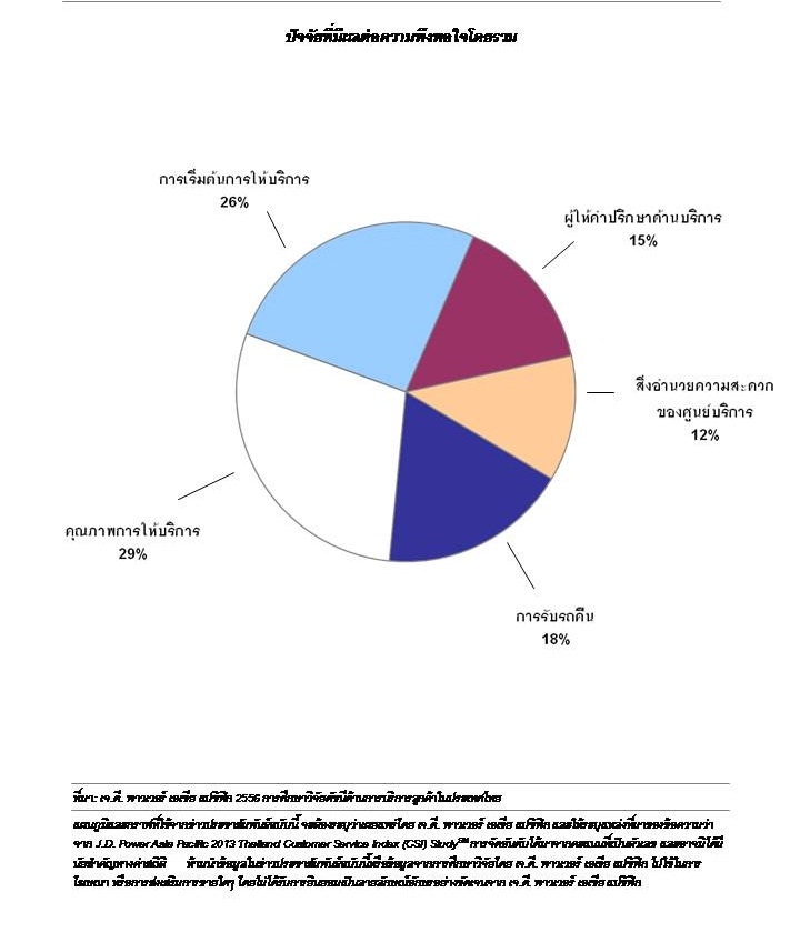 ผลการศึกษาวิจัยดัชนีด้านการบริการลูกค้าในประเทศไทย ประจำปี 2556 โดย เจ.ดี.พาวเวอร์ เอเชีย แปซิฟิก (J.D. Power Asia Pacific 2013 Thailand Customer Service Index (CSI) StudySM) เปิดเผยในวันนี้ว่า ขั้นตอนเริ่มต้นในการให้บริการและการมอบรถยนต์ให้กับพนักงานของศูนย์บริการถือเป็นขั้นตอนที่มีความสำคัญที่สุดสองอันดับแรกที่ส่งผลต่อความพึงพอใจในการบริการหลังการขายโดยรวมของศูนย์บริการมาตรฐาน การศึกษาวิจัยนี้เป็นการวัดระดับความพึงพอใจต่อขั้นตอนการบริการหลังการขายที่เจ้าของรถยนต์ใหม่ได้รับจากศูนย์บริการมาตรฐานจาก 5 ปัจจัยหลัก ได้แก่ การเริ่มต้นให้บริการ ที่ปรึกษาด้านบริการ สิ่งอำนวยความสะดวกของศูนย์บริการ การรับรถคืน และคุณภาพงานบริการ ค่าดัชนีการให้บริการของศูนย์บริการคำนวณจากการให้คะแนนโดยมีคะแนนเต็ม 1,000 คะแนน ปัจจัยด้านการเริ่มต้นให้บริการมีผลต่อดัชนีการบริการลูกค้าโดยรวมเพิ่มขึ้นจาก 12% ในปี 2555 มาอยู่ที่ 26% ในปี 2556 ในขณะที่ปัจจัยด้านคุณภาพงานบริการแม้ว่ายังคงเป็นปัจจัยที่ส่งผลกระทบมากที่สุดต่อความพึงพอใจโดยรวม แต่กลับลดลงจาก 42% ในปี 2555 เหลือเพียง 29% “ขณะที่คุณภาพงานบริการได้รับการปรับปรุงให้ดีขึ้นอย่างต่อเนื่อง ประกอบกับรถยนต์ที่เข้ารับบริการในศูนย์บริการทวีจำนวนเพิ่มขึ้นอย่างเห็นได้ชัด อันเป็นผลมาจากการขยายตัวของตลาด ลูกค้าจึงมีความกังวลในการเข้าคิวรอที่ยาวนาน ส่งผลให้ลูกค้าหันมาให้ความสนใจเพิ่มมากขึ้นในขั้นตอนการทำการนัดหมายล่วงหน้า, ความยืดหยุ่นของศูนย์บริการในการปรับเปลี่ยนตารางเวลาการเข้ารับบริการ รวมถึงความพร้อมและความเอาใจใส่ในขั้นตอนการมอบรถยนต์ให้กับทางศูนย์บริการ” โลอิค เปอ็อง ผู้จัดการอาวุโสของ เจ.ดี. พาวเวอร์ เอเชีย แปซิฟิก กล่าว
