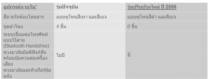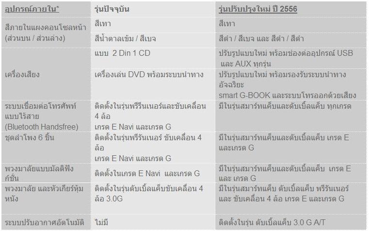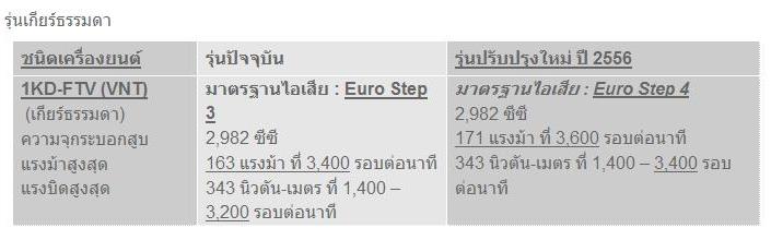 ไฮลักซ์ วีโก้ แชมป์...รุ่นปรับปรุงใหม่ปี 2556 จำนวน 2 รุ่นประกอบด้วย - รุ่นสมาร์ท แค็บ พรีรันเนอร์ เกียร์อัตโนมัติ 5 สปีด 2.5G A/T (Navi) - รุ่นสมาร์ท แค็บ พรีรันเนอร์ เกียร์อัตโนมัติ 5 สปีด 2.5E ABS A/T พร้อม ถุงลมเสริมความปลอดภัยคู่หน้าและเข็มขัดนิรภัยระบบดึงรั้งกลับ...มาตรฐานความปลอดภัย ในทุกรุ่น เครื่องยนต์ใหม่...รองรับมาตรฐานมลพิษไอเสีย ยูโร ระดับ 4 ทุกรุ่น พร้อมเพิ่มแรงม้าในเครื่อง ยนต์ 3.0 ลิตร