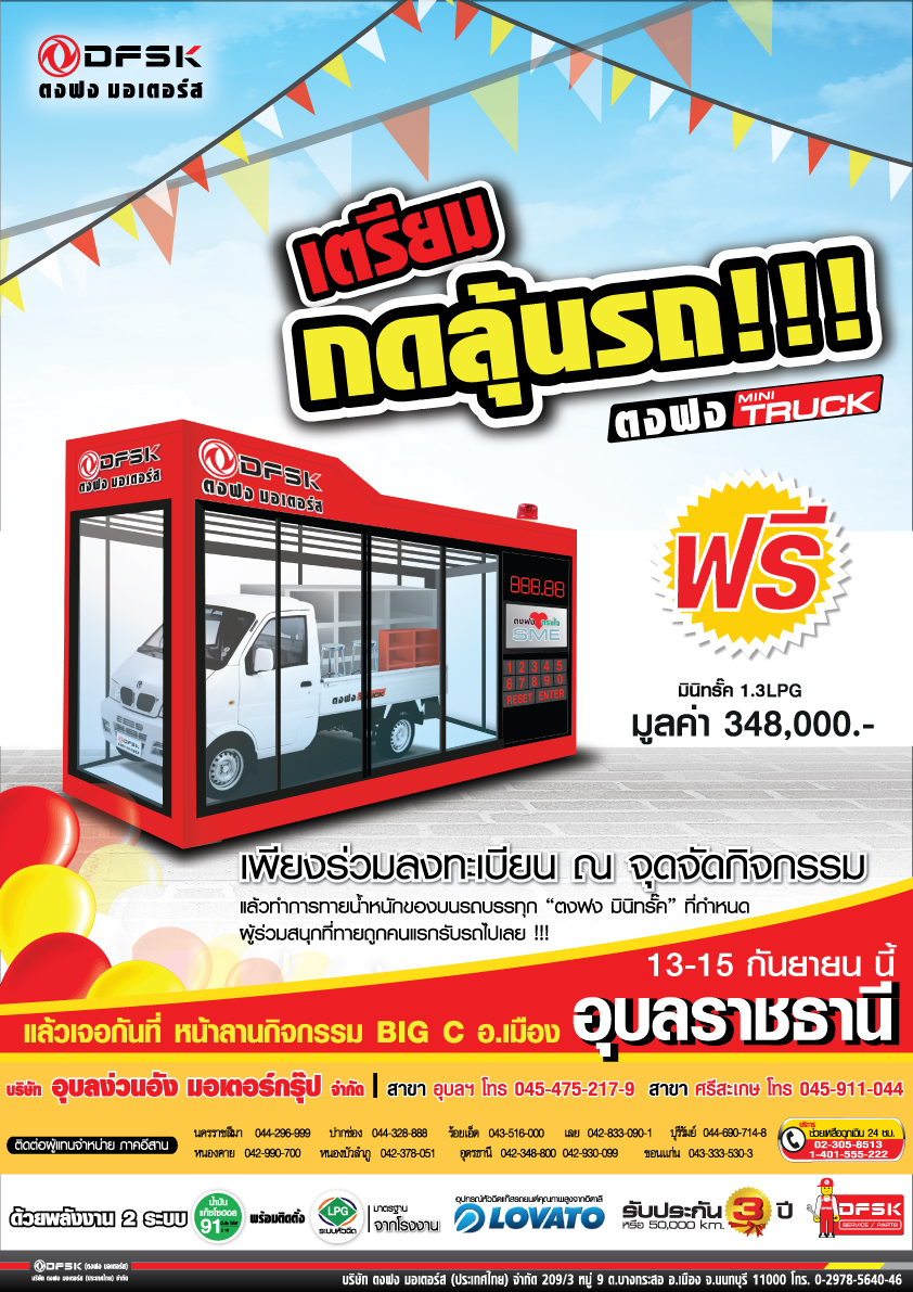 นายพิทยา ธนาดํารงศักดิ์ กรรมการผู้จัดการ บริษัท ตงฟง มอเตอร์ส (ประเทศไทย) ผู้ผลิตและจัดจำหน่ายรถยนต์เชิงพาณิชย์ขนาดเล็กจากประเทศจีน เปิดเผยว่า ยอดขายรถมินิทรั๊คในต่างจังหวัด มีการเติบโต สูงขึ้นมาก เนื่องจากผู้ประกอบการในต่างจังหวัดให้ความสนใจในเรื่องของการประหยัดต้นทุนทางด้านการขนส่งมากขึ้น จึงพร้อมเดินหน้าขอบคุณลูกค้ากับแคมเปญ “ก้าวสู่ปีที่ 5 กับตงฟง มอเตอร์ส” ณ บิ๊กซี จังหวัดอุบลราชธานี ระหว่างวันที่ 13 -15 กันยายน 2556 “จากภาพรวมตลาดรถยนต์เพื่อการพาณิชย์ หรือรถกระบะขนาด 1 ตันในช่วงครึ่งปีแรก มียอดขายทั้งตลาดอยู่ที่ 352,051 คัน ซึ่งเพิ่มขึ้น 36.7% เมื่อเทียบกับช่วงเดียวกันของปีที่แล้ว สำหรับ ตงฟง มอเตอร์ส มีการเติบโตขึ้นถึง 50% โดยมียอดขายอยู่ที่ 1,500 คัน ซึ่งพบว่าสัดส่วนยอดขายที่มาจากภาคอีสานสูงที่สุดจากทั่วประเทศ นับเป็น 40% ของยอดขายทั้งหมด และจังหวัดที่ทำยอดขายมากที่สุดของภาคอีสานคือจังหวัดอุบลราชธานีมียอดขายคิดเป็น 16% ของทั้งภาค ดังนั้น ตงฟง มอเตอร์ส จึงได้รุกจัดกิจกรรมส่งเสริมการขายที่จังหวัดอุบลราชธานีนี้ เนื่องจากว่าดีลเลอร์ที่นี่เพิ่งเปิดได้ไม่นาน แต่มียอดขายที่เติบโตอย่างรวดเร็ว และได้รับการจัดอันดับว่าเป็นหนึ่งในดีลเลอร์เกรด A ของตงฟง มอเตอร์ส ซึ่งนอกจากจะเป็นการขอบคุณลูกค้าในอุบลราชธานีที่ให้การสนับสนุนอย่างดีแล้ว เราคาดว่าเป็นโอกาสที่ดีในการดึงดูดลูกค้าฐานใหม่ๆ ที่กำลังมองหารถเชิงพาณิชย์สำหรับทำธุรกิจขนาดย่อม และสนใจรถมินิทรั๊คเป็นทุนเดิม ภายในงานลูกค้าและผู้เข้าร่วมกิจกรรมจะได้พบกับกล่องยักษ์บรรจุรถมินิทรั๊ค (Mini Truck) จากแคมเปญ “ก้าวสู่ปีที่ 5 กับตงฟง มอเตอร์ส” โดยเปิดให้ผู้ที่เข้าร่วมงานได้ทายสมรรถนะในการบรรทุกน้ำหนักของรถตงฟง มินิทรั๊ค (Mini Truck) เพียงแค่กดปุ่มตัวเลข 5 หลัก ซึ่งหากผู้ร่วมกิจกรรมทายน้ำหนักได้ถูกต้อง ก็จะได้รับรถตงฟงมินิทรั๊ค (Mini Truck) รุ่น 1.3ไปเลยฟรีๆ ซึ่งกิจกรรมนี้จะจัดขึ้นระหว่างวันที่ 13 -15กันยายน 2556 ณ บิ๊กซี อำเภอเมือง จังหวัดอุบลราชธานี ด้านนายฉัตรชัย จึงวิมุติพันธ์ ผู้จัดจำหน่าย ตงฟง มอเตอร์ส (ประเทศไทย) อุบลราชธานี กล่าวว่า หลังเปิดให้บริการ มาประมาณ 1 ปี เราได้รับการตอบรับที่ดีจากกลุ่มค้า ทั้งจากผู้ประกอบการในภาคธุรกิจต่างๆ ซึ่งรถมินิทรั๊ค มียอดขายดีเป็นอันดับต้นๆ รองลงมา คือ รถุร่นมินิแวน ซึ่งกลุ่มลูกค้าส่วนใหญ่เป็นผู้ประกอบการธุรกิจเอสเอ็มอี และชาวสวน ชาวไร่ เนื่องจากคุณสมบัติและราคาของ รถมินิทรั๊ค ตงฟง ยังเป็นที่ดึงดูดใจ และตอบโจทย์สำหรับชาวสวน 