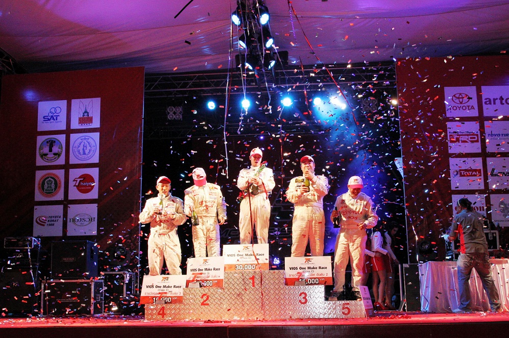 Vios One Make Race Class C วีออส วันเมคเรซ คลาส ซี รายการที่มีรถเข้าแข่งมากที่สุด 25 คันกับ 20 รอบสนาม เริ่มการแข่งขันรถทุกคันเร่งแซงเต็มที่ เพื่อเข้าโค้งขวาซึ่งมีการเบียดกันไปแล้วในรุ่นก่อนหน้า นักแข่งรุ่นนี้จึงเพิ่มความระมัดระวังในการเข้าโค้งเป็นพิเศษ เดชาธร ภู่อัครวุฒิ แซงขึ้นนำเป็นอันดับ 1 หลังผ่านโค้งแรก และครองแชมป์ของสนามนี้ไปได้ ส่วนรองแชมป์เป็นของ ชลวิทย์ นุยา จากทีมภูเก็ตศรีแสนสุชาติขนส่งอีกเช่นกัน ส่วนอันดับที่ 3 ปรม พวงงาม นักแข่งจาก TSL AIT A CAR RACING TEAM สามารถเร่งแซงเข้ามาอยู่ที่ 3 นักแข่งจากญี่ปุ่น ชิบะ เคนทาโร่ เข้าป้ายในอันดับที่ 4 ตามมาด้วย โชติวรุตม์ วิริยวัขรมงคล ในอันดับที่ 5 ผลการแข่งขัน วีออส วันเมคเรซ คลาสซี ทีม เวลารวม 1 72 เดชาธร ภู่อัครวุฒิ ภูเก็ตศรีแสนสุชาติขนส่ง 25.53.562 2 51 ชลวิทย์ นุยา ภูเก็ตศรีแสนสุชาติขนส่ง 26.01.383 3 54 ปรม พวงงาม TSL AIT A CAR RACING TEAM 26.20.006 4 50 CHIBA KENTARO - 26.33.142 5 41 โชติวรุตม์ วิริยวัชรมงคล RACE FACTORY RPII TIEN ATR MOTORSPORT -