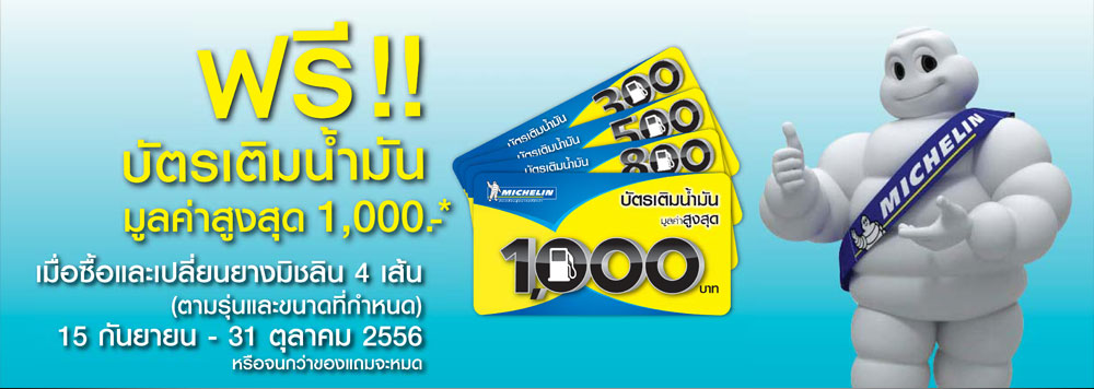 มิชลิน จัดโปรโมชั่นสุดคุ้ม ซื้อยาง มิชลิน สำหรับรถยนต์นั่ง, รถเอสยูวี, รถ 4x4, รถกระบะ และรถตู้จำนวน 4 เส้น ในรุ่นและขนาดที่กำหนด รับบัตรเติมน้ำมัน ฟรี มูลค่าสูงสุด 1,000 บาท ที่ศูนย์บริการรถยนต์ครบวงจร ไทรพลัส และร้านผู้แทนจำหน่ายยาง มิชลิน ที่ร่วมรายการ ตั้งแต่วันนี้ถึง 31 ตุลาคม 2556 สนใจสอบถามรายละเอียดเพิ่มเติมได้ที่ มิชลิน ฮอตไลน์ 02-793-6900 หรือที่ www.michelin.co.th