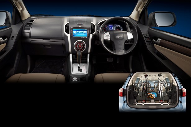 สำหรับการออกแบบภายในหรูหราสไตล์ยุโรป ด้วยแนวคิด “PREMIUM & EXCLUSIVE” โดดเด่นด้วยการใช้คู่สีแบบทูโทนสวยงามลงตัว พร้อมอรรถประโยชน์ที่มอบอิสระในการใช้ชีวิตได้อย่างลงตัวตามศาสตร์การออกแบบ ISUZU UNIVERSAL DESIGN โดยให้ผู้ใช้รถเป็นศูนย์กลาง ด้วยการจัดวางตำแหน่งที่นั่ง และอุปกรณ์ต่างๆ ภายในรถให้เข้ากับทุกสรีระ เพื่อการใช้งานง่าย สะดวกสบาย และใช้งานได้หลากหลายลงตัวตั้งแต่ที่นั่งตอนหน้าถึงตอนที่สาม พร้อมบรรยากาศโปร่งโล่งสบาย ด้วยพื้นที่เหนือศีรษะและพื้นที่วางเท้าที่เหนือกว่ารถระดับเดียวกัน เบาะนั่งกึ่งหนังแท้สีไอวอรี่ เกรดพิเศษให้ผิวสัมผัสนุ่มนวล ที่นั่งด้านคนขับแบบปรับไฟฟ้า 6 ทิศทาง