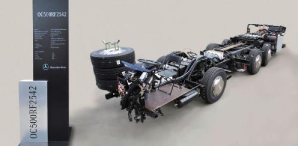 แชสซีรถโดยสาร รุ่น OC 500 RF 2542 แชสซีรถโดยสารใหม่นำเข้าจากประเทศสเปน รุ่น OC 500 RF 2542 ความยาวสูงสุด 15 เมตรได้รับการออกแบบสำหรับตัวถังรถโดยสารให้มีขนาดความกว้างสูงสุดถึง 2.55 เมตร และสามารถต่อตัวถังที่มีความยาวสูงสุดสำหรับรถโดยสารสองเพลา (6 ล้อ) ที่ 13.5 เมตร และ ยาวถึง 14.6 เมตร สำหรับรถโดยสารสามเพลา (8 ล้อ) เป็นแชสซีที่เปี่ยมไปด้วยคุณภาพ ความแข็งแรงทนทาน มาพร้อมกับเครื่องยนต์อันทรงพลัง OM457LA เทอร์โบอินเตอร์คูลเลอร์ มีความจุกระบอกสูบ 11,967 ซีซี ให้กำลังสูงสุดถึง 310 กิโลวัตต์ (422 แรงม้า) ที่ 2,000 รอบต่อนาที แรงบิดสูงสุด 1,900 นิวตันเมตรที่ 1,100 รอบต่อนาที โดยแชสซีมีขนาด (กว้างxยาวxสูง) ที่ 2,510 x 14,355 x 1,720 มม. มีระบบการจัดการเครื่องยนต์ควบคุมโดยอิเล็กทรอนิกส์ รวมถึงระบบยูนิตปั๊ม ซึ่งช่วยให้การจ่ายน้ำมันเชื้อเพลิงเป็นไปได้อย่างมีประสิทธิภาพ ให้สมรรถนะที่ดียิ่งขึ้น แรงบิดที่สูงขึ้นในรอบเครื่องที่ต่ำ รวมถึงช่วยประหยัดเชื้อเพลิง และยืดอายุการใช้งานเพิ่มเติมอีกด้วย ด้านระบบความปลอดภัย เพียบพร้อมไปด้วยอุปกรณ์มาตรฐานและระบบความปลอดภัย ไม่ว่าจะเป็นโปรแกรมควบคุมการทรงตัวอัตโนมัติ ESP® ระบบป้องกันการลื่นไถล (ASR) ระบบเบรกอิเล็กทรอนิกส์ (EBS) ระบบป้องกันล้อล็อค (ABS) ระบบเพิ่มแรงเบรกอัตโนมัติ รีทาร์ดเดอร์ และระบบเบรกไอเสีย และระบบเบรกจากหัวลูกสูบ โดยจะเป็นดิสค์เบรกทุกล้อ และเพลาหน้าแบบคานอิสระ ซึ่งให้ความนุ่มนวลแก่ผู้โดยสาร ความสะดวกสบายในการขับขี่ และความปลอดภัยเพิ่มขึ้น นอกจากนั้นเพลาท้ายซึ่งถือว่าเป็นส่วนสำคัญของแชสซีรุ่นนี้ ได้ถูกออกแบบให้มีสภาพแข็งแรง ทนทาน เพื่อให้อายุการใช้งานยาวยิ่งขึ้น อีกทั้งยังให้สมรรถนะในการขับขี่อันเป็นเลิศ และกำลังในการเบรกสูงสุด อีกทั้งยังมีระบบอิเล็คโทรไฮดรอลิก ในการควบคุมบังคับเลี้ยวเพลาที่ 3 โดยสามารถบังคับได้ทั้งขับเคลื่อนเดินหน้า หรือ ถอยหลังด้วย