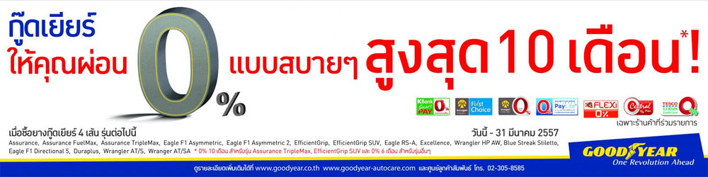 กู๊ดเยียร์ ประเทศไทย จัดโปรโมชั่นพิเศษส่งท้ายปีให้ลูกค้าผ่อนยาง 0% สบายๆ นานสูงสุดถึง 10 เดือน เมื่อซื้อยางกู๊ดเยียร์ 4 เส้น * ที่ กู๊ดเยียร์ ออโต แคร์, กู๊ดเยียร์ อีเกิ้ล สโตร์, กู๊ดเยียร์ เซอร์วิส เซ็นเตอร์ และตัวแทนจำหน่ายยาง กู๊ดเยียร์ ที่ร่วมรายการทั่วประเทศ ตั้งแต่วันนี้ถึง 31 มีนาคม 2557 สอบถามรายละเอียดเพิ่ม ณ จุดขาย, เว็บไซท์ goodyear.co.th หรือ goodyear-autocare.com หรือ ศูนย์ลูกค้าสัมพันธ์ โทร. 02-305-8585 หมายเหตุ: * ยางกู๊ดเยียร์ ที่ร่วมรายการรวม 15 รุ่น ได้แก่ Assurance, Assurance FuelMax, Assurance TripleMax, Eagle F1 Asymmetric, Eagle F1 Asymmetric 2, EfficientGrip, EfficientGrip SUV, Eagle RS-A, Excellence, Wrangler HP AW, Blue Streak Stiletto, Eagle F1 Directional 5, Duraplus, Wrangler AT/S และ Wrangler AT/SA