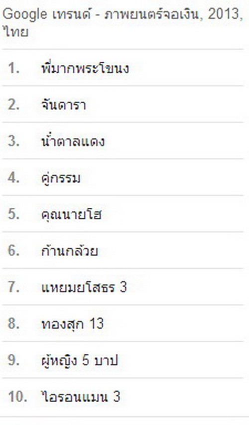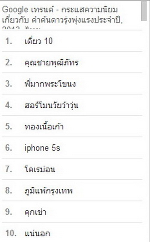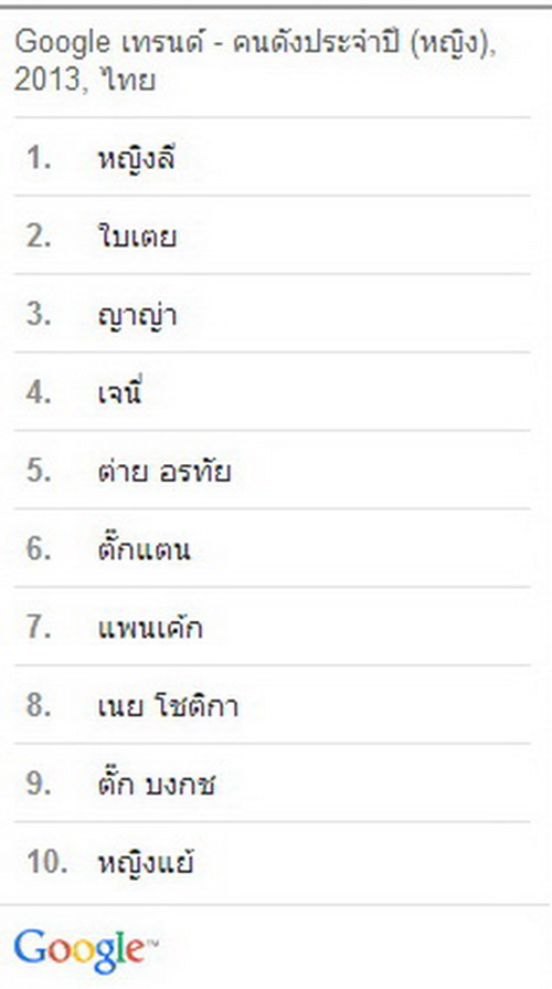Google เว็บไซต์ค้นหาข้อมูลบนอินเทอร์เน็ต เปิดเผยผลการจัดอันดับการค้นหาข้อมูลที่ได้รับความนิยมสูงสุดเฉพาะประเทศไทย Google เปิดเผยว่าคำที่ถูกค้นหามากที่สุดคือ “รถมือสอง” “ราคาทอง” และ “คนอวดผี” ตามลำดับ โดยยังมีคำว่า “หางาน” เป็นคำที่ถูกค้นหามากเป็นอันดับ 9 ของไทยด้วย ขณะที่ “เดี่ยว 10” “คุณชายพุฒิภัทร” และ “พี่มากพระโขนง” เป็นคำที่ถูกค้นหาเพิ่มขึ้นอย่างเด่นชัด