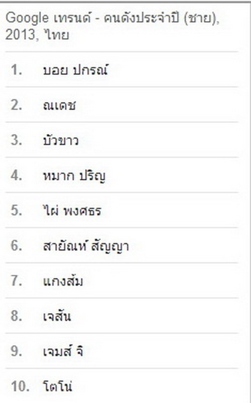 บุคคลที่ถูกค้นหามากที่สุดของประเทศไทย ฝ่ายชายคือ บอย-ปกรณ์ ฉัตรบริรักษ์ ณเดช คูกิมิยะ ดารานักแสดงชื่อดัง และบัวขาว ป.ประมุข นักกีฬามวยไทย ส่วนฝ่ายหญิงคือ หญิงลี ศรีจุมพล เจ้าของเพลง “ขอใจเธอแลกเบอร์โทร” รองลงมาคือ ใบเตย อาร์สยาม นักร้องลูกทุ่ง และญาญ่า-อุรัสยา สเปอร์บันด์ ดารานักแสดง