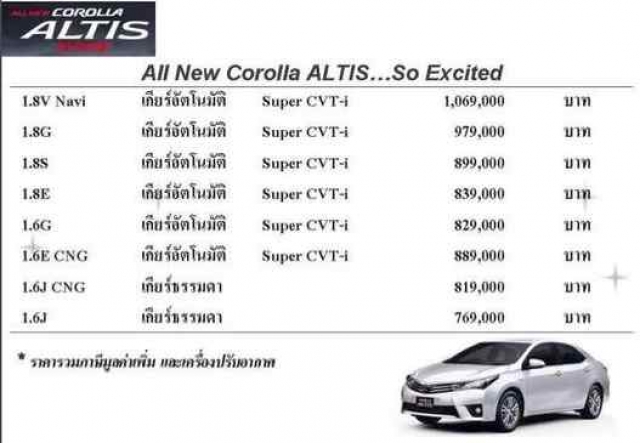 โตโยต้าเปิดตัว "โคโรลล่า อัลติส ใหม่…So Excited” รุ่นล่าสุด เจนเนอเรชั่นที่ 11 รถยนต์นั่งยอดนิยมของคนไทย เคาะราคารุ่นต่ำสุด 1.6J เกียร์ธรรมดา 769,000 บาท เกียร์อัติโนมัติ 1.6G 829,000 พร้อมรุ่น CNG ขณะที่รุ่นท็อป 1.8 V เคาะราคาล้านต้นๆ