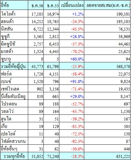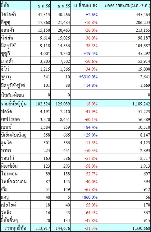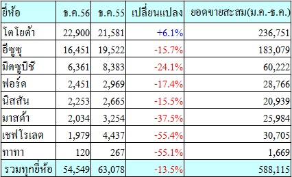 โตโยต้าเผยตลาดรถยนต์ปี 2556 มียอดขายรวม 1,330,668 คัน ลดลง 7.4% เมื่อเทียบกับช่วงเวลาเดียวกันของปีก่อน พร้อมชี้ตลาดรวมในประเทศปีนี้มีแนวโน้มลดลงต่อเนื่อง คาดว่าจะมียอดขายรวมทั้งหมด 1,150,000 คัน หรือลดลงจากปีที่ผ่านมาประมาณ 13.6%