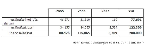 มิตซูบิชิ มอเตอร์ส ประเทศไทย ประกาศความสำเร็จด้านการผลิตมิราจในประเทศไทย 2 ปีจำนวนกว่า 200,000 คัน และส่งออกไปยัง 66 ประเทศทั่วโลก มร.มาซะฮิโกะ อูเอะกิ กรรมการผู้จัดการใหญ่ บริษัท มิตซูบิชิ มอเตอร์ส (ประเทศไทย) จำกัด เปิดเผยถึงความสำเร็จของการแนะนำรถยนต์มิตซูบิชิ มิราจว่า นับตั้งแต่เปิดตัวในเดือนมีนาคม 2555 จนถึงกลางเดือนมกราคม 2557 ที่ผ่านมาบริษัทฯได้ผลิตรถยนต์มิตซูบิชิ มิราจไปแล้วกว่า 200,000 คัน โดยเป็นการผลิตเพื่อจำหน่ายในประเทศ 77,691 คัน หรือคิดเป็นสัดส่วน 39% และเพื่อการส่งออกไปกว่า 66 ประเทศทั่วโลก 122,309 คัน หรือคิดเป็น 61 % ทั้งนี้ยอดการผลิตดังกล่าว นอกจากสะท้อนให้เห็นถึงกระแสการตอบรับในรถยนต์มิตซูบิชิ มิราจจากตลาดทั่วโลกแล้วยังแสดงให้เห็นถึงศักยภาพการผลิตของบริษัทฯ ที่สามารถบรรลุเงื่อนไขของคณะกรรมการส่งเสริมการลงทุน BOI ที่จะต้องมีการผลิตจริงไม่น้อยกว่า 100,000 คันต่อปี ตั้งแต่ปีที่ 5 เป็นต้นไปหลังจากเปิดไลน์การผลิต โดยในปีที่ผ่านมาซึ่งเป็นปีที่ 2 ของการผลิต บริษัทฯก็มียอดการผลิตรวมสูงถึง 115,865 คัน