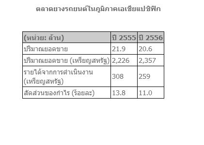 บริษัท กู๊ดเยียร์ ไทร์ แอนด์ รับเบอร์ จำกัด สหรัฐอเมริกา แถลงผลประกอบการประจำไตรมาส 4/2556 และตลอดปี 2556 โดย ริชาร์ด เจ. เครเมอร์ ประธานกรรมการและประธานเจ้าหน้าที่บริหาร เผยว่า “ผลการดำเนินงานอันโดดเด่นของบริษัทในไตรมาส 4/2556 และตลอดปี 2556สะท้อนให้เห็นว่ากลยุทธ์การดำเนินงานของเราใช้ได้ผลและกู๊ดเยียร์มีศักยภาพที่จะสร้างการเติบโตอย่างยั่งยืน โดยภูมิภาคอเมริกาเหนือสามารถบรรลุเป้าหมายการขายได้ตลอดทั้ง 4 ไตรมาส" สำหรับปี 2556 กู๊ดเยียร์มียอดขาย 19,500 ล้านเหรียญสหรัฐ ลดลงร้อยละ 7 จากปี 2555 ซึ่งเกิดจากยอดขายในกลุ่มธุรกิจประเภทยาง โดยเฉพาะอย่างยิ่งธุรกิจการจำหน่ายเคมีภัณฑ์ที่ผลิตโดยบริษัทคู่ค้าในภูมิภาคอเมริกาเหนือที่มีมูลค่าลดลง 665 ล้านเหรียญสหรัฐ ผลกระทบจากอัตราแลกเปลี่ยนคิดเป็นมูลค่า 354 ล้านเหรียญสหรัฐ ปริมาณการขายยางรถยนต์ที่ลดลง 166 ล้านเหรียญสหรัฐ และกลยุทธ์ราคา/ ความหลากหลายของ ผลิตภัณฑ์ที่มีมูลค่าลดลง 206 ล่านเหรียญสหรัฐ ปริมาณยางรถยนต์ที่จำหน่ายได้ทั้งหมดในปี 2556 มีจำนวนทั้งสิ้น 162.3 ล้านเส้น ลดลงจากปี 2555 ร้อยละ 1 สำหรับรายได้จากการดำเนินงานในกลุ่มผลิตภัณฑ์ยางรถยนต์ของปี 2556 จำนวน 1,600 ล้านเหรียญสหรัฐ เพิ่มขึ้นร้อยละ 27 เมื่อเทียบกับปี 2555 ซึ่งเป็นผลจากกลยุทธ์ราคา/ความหลากหลายของผลิตภัณฑ์ที่ไม่รวมวัตถุดิบที่สร้างรายได้เพิ่มขึ้น 436 ล้านเหรียญสหรัฐ (ไม่รวมถึงการลดต้นทุนด้านวัตถุดิบ) แต่บริษัทก็มีค่าใช้จ่ายต่อหัวที่เพิ่มขี้น 52 ล้านเหรียญสหรัฐ ทั้งยังได้รับผลกระทบจากอัตราแลกเปลี่ยนคิดเป็นมูลค่า 63 ล้านเหรียญสหรัฐ และมีปริมาณการขายยางรถยนต์ลดลง 24 ล้านเหรียญสหรัฐ