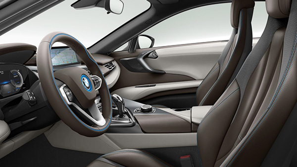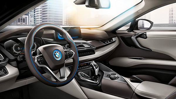 ความโฉบเฉี่ยวที่สะดุดตาตั้งแต่ภายนอก จนถึงภายในของบีเอ็มดับเบิลยู i8 ทุกส่วนของภายใน ที่ผลิตจากวัสดุน้ำหนักเบา และถูกจัดวางอย่างลงตัว อุปกรณ์ทุกชิ้นถูกคิดค้น ในการออกแบบให้มีลำดับขั้นตอนการใช้งานที่ง่าย ชัดเจน การสร้างชิ้นส่วนต่างๆให้มีน้ำหนักเบา เช่นแผงประตูด้านในสร้างจากคาร์บอนไฟเบอร์ ที่เป็นสุดยอดของวัสดุที่แข็งแกร่งและลดน้ำหนักได้อย่างเห็นผล