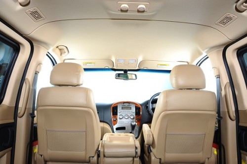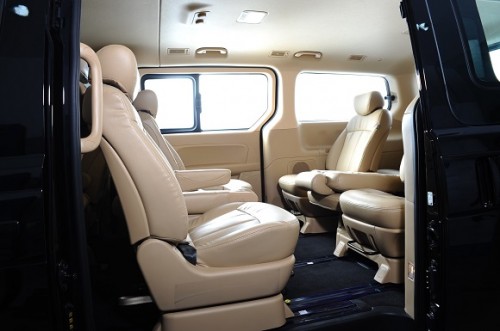 ด้วยประตูหลังแบบสไลด์สองข้าง เปิด-ปิดเบาแรง เบาะโดยสารแบบ 12 ที่นั่ง หุ้มด้วยหนังแท้ ซึ่งเบาะโดยสารแบบวี.ไอ.พี.สามารถปรับหมุนได้ 180 องศา 1 คู่ แถวแรกสามารถปรับหมุน 180 องศา หันหน้าเข้าหาเบาะนั่งในแถวที่ 2 เปลี่ยนให้ห้องโดยสารกลายเป็นห้องนั่งเล่น หรือสำนักงานเคลื่อนที่ได้ไม่ยาก พื้นที่ภายในห้องโดยสารโอ่อ่า กว้างขวางบริเวณคอนโซลด้านหน้า ตกแต่งเสริมความหรูหราและอบอุ่นด้วยลายไม้ ชุดเครื่องเสียง อุปกรณ์ความบันเทิงครบครัน เพิ่มความสะดวกให้ผู้ขับด้วยปุ่มควบคุมที่พวงมาลัย