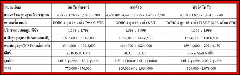 หากเทียบกันช่วงราคารุ่น 1.6 ลิตร ราคาประมาณ 8.7 แสนบาท จะเป็นการชนกันของนิสสัน พัลซาร์ กับมาสด้า3 ถือว่าสูสีในเรื่องของออปชั่น แต่เครื่องยนต์และเกียร์พัลซาร์ค่อนข้างดูมีภาษีกว่า และหากประกบราคา 8.39 แสนบาท รวมถึงรุ่นราคาประมาณ 9.7แสนบาท ของรุ่นพัลซาร์และโฟกัส แน่นอนคงต้องยกให้กับฟอร์ด โฟกัสเด่นกว่า จะแพ้เพียงระบบนำทาง และหลังคาซันรูฟเท่านั้น ทั้งนี้มองภาพรวมๆ จะเห็นว่า... มาสด้า3 มีการสร้างแบรนด์ไว้ดีใช้ได้ คงสามารถดึงลูกค้าที่เป็นแฟนพันธุ์แท้มาอยู่ในมือ แต่หากจะเอาเทคโนโลยีและความทันสมัย คงต้องมาดู ฟอร์ด โฟกัส เป็นหลัก ขณะที่กลางๆ ราคาและอุปกรณ์สมน้ำสมเนื้อ นิสสัน พัลซาร์ น่าจะเป็นคำตอบ? แต่ย้ำเช่นเดิมขอให้ลองขับทุกรุ่น ก่อนตัดสินใจซื้อทุกครั้ง…