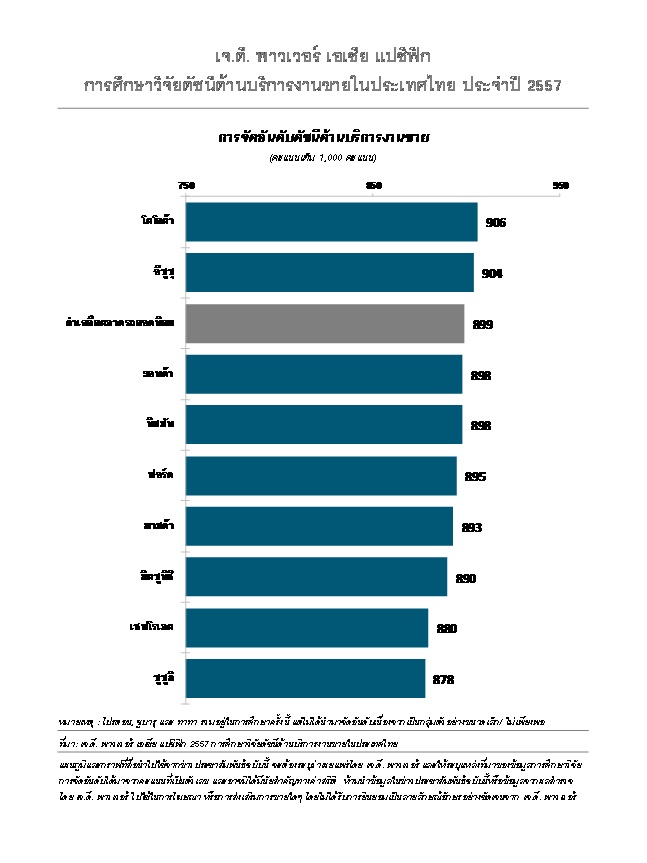 คะแนนความพึงพอใจโดยรวมของตลาดรถยนต์แบรนด์ยอดนิยมในปี 2557เฉลี่ยอยู่ที่ 899 คะแนน ลดลงจากปี 2556 ซึ่งอยู่ที่ 904 คะแนน คะแนนความพึงพอใจที่ลดลงเป็นผลมาจากปัจจัยด้านการเจรจาตกลงที่ลดลง 11 คะแนน,การเริ่มต้นการขาย (ลดลง 10 คะแนน) และการจัดเตรียมเอกสาร (ลดลง 9 คะแนน)