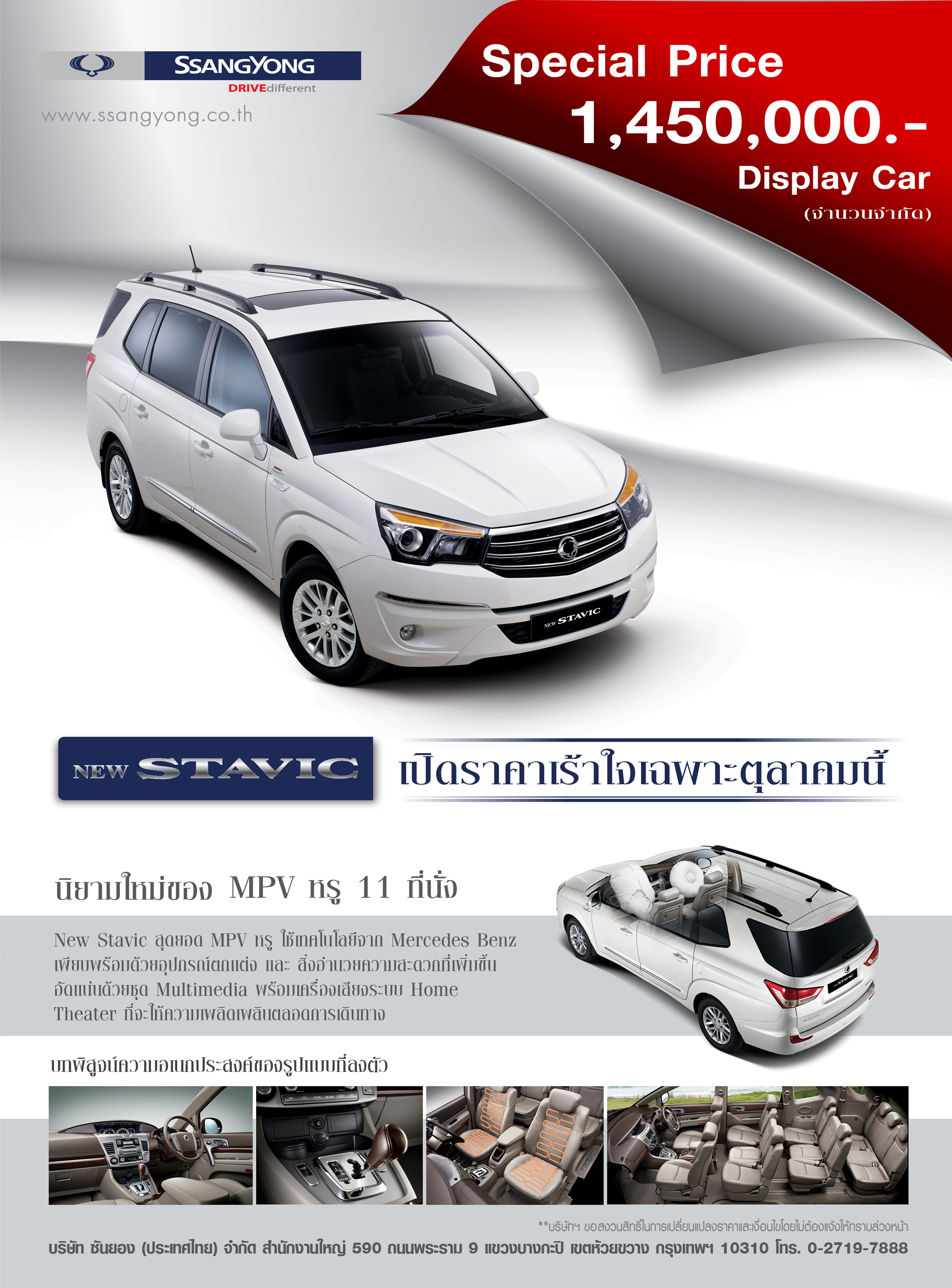 บริษัท ซันยอง (ประเทศไทย) จำกัด จัดแคมเปญ Display Car เพื่อมอบโอกาสให้กับลูกค้าได้จับจองรถยนต์ New Stavic สุดยอด MPV หรูในราคาพิเศษสุด โดยแคมเปญ Display Car จะเปิดราคาเร้าใจเฉพาะเดือนตุลาคมนี้เท่านั้น ลูกค้าที่สนใจจะมาเป็นเจ้าของรถคุณภาพระดับหรู ในราคาพิเศษสุดๆ ได้ที่ โชว์รูมซันยอง พระรามเก้า หรือ ตามสถานที่โรดโชว์ทั้งในกรุงเทพ และต่างจังหวัดถึง 5 แห่ง ตลอดเดือนตุลาคมนี้ เริ่มด้วย The Mall บางแค วันที่ 3-8 ตุลาคม ต่อด้วยที่เชียงใหม่เซ็นทรัลเฟสติวัล วันที่ 6-12 ตุลาคม แหลมทอง จังหวัดระยอง วันที่ 7-15 ตุลาคม โลตัส ศรีนครินทร์ วันที่ 16-23 ตุลาคม ปิดท้ายที่ห้างซีคอน สแควร์ วันที่ 20-26 ตุลาคมนี้