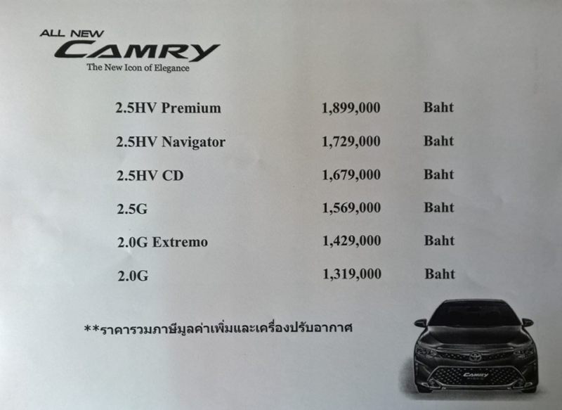 Toyota Camry ใหม่ มีสีภายนอกให้เลือก 7 สี รวม 2 สีใหม่ คือ Grayish Blue Mica Metallic และ Dark Brown Mica Metallic ส่วนสีอื่นๆ ประกอบไปด้วย Attitude Black Mica, Silver Metallic และ Gray Metallic ปิดท้ายด้วย 2 สีเฉพาะตัวสำหรับรุ่นไฮบริด White Pearl Crystal และ True Blue Mica Metallic • ราคาจำหน่าย • Toyota Camry HV Premium ราคา 1,899,000 บาท • Toyota Camry HV Navi ราคา 1,729,000 บาท • Toyota Camry HV CD ราคา 1,679,000 บาท • Toyota Camry 2.5G ราคา 1,569,000 บาท • Toyota Camry 2.5G Extremo ราคา 1,429,000 บาท • Toyota Camry 2.0G ราคา 1,319,000 บาท