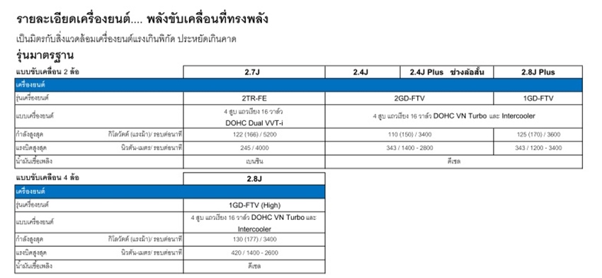 REVOLUTION OF POWER GD Efficient Boost เครื่องยนต์ดีเซลคอมมอนเรล เจเนอเรชั่นล่าสุดจากโตโยต้า พลังขับเคลื่อนที่แรงขึ้นอีกขั้น ให้แรงบิดสูงสุดในรอบกว้าง (Flat Torque) ครอบคลุมทุกการใช้งาน ระบบเทอร์โบแปรผันใหม่ (VN Turbo) ออกแบบให้มีขนาดเล็กลงแต่ประสิทธิภาพมากขึ้น หัวฉีดเทคโนโลยีล่าสุดปั๊มแรงดันสูง 220 MPa ฉีดน้ำมันเป็นละอองฝอย เผาไหม้สมบูรณ์หมดจด เพิ่มระดับความประหยัดให้มากยิ่งขึ้น เครื่องยนต์ทำงานเงียบ และสั่นสะเทือนน้อยกว่า มาพร้อมกับระบบตัดการทำงานของเครื่องยนต์อัตโนมัติ (Stop & Start System) เมื่อรถหยุดนิ่ง และจะสตาร์ทเครื่องยนต์ขึ้นใหม่โดยอัตโนมัติเมื่อแตะคันเร่ง จึงช่วยให้ประหยัดน้ำมันและลดไอเสียได้อย่างมีประสิทธิภาพ และเป็นมิตรกับสิ่งแวดล้อมยิ่ขึ้น กับระบบ EGR (Exhaust Gas Recirculation) หรือการนำไอเสียหมุนเวียนกลับมาใช้ใหม่ ช่วยลดความร้อนของเครื่องยนต์ขณะทำงาน ลดมลพิษได้เต็มประสิทธิภาพตามมาตรฐาน Euro 4