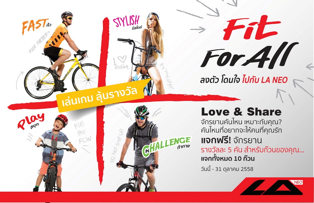 แอลเอกรุ๊ปมั่นใจในธุรกิจจักรยานที่จะเติบโตจากกระแส “ปั่นเพื่อแม่ Bike for Mom” รวมถึงการที่ภาครัฐมีมาตรการเข้ามากระตุ้นเศรษฐกิจ รุกตลาดต่อเนื่องเปิดจักรยานแบรนด์ใหม่ล่าสุด “แอลเอ นีโอ (LA Neo)” ด้วยจักรยานกว่า 47 รุ่น เพื่อให้ครอบคลุมกลุ่มเป้าหมายทุกเซกเมนต์ พร้อมระเบิดแคมเปญ Fit for All : Love and Share : LA Neo แจกจักรยานยกก๊วน 10 ก๊วน มูลค่ากว่า 500,000 บาท ตั้งเป้ายอดขายเพิ่มอีก 15%