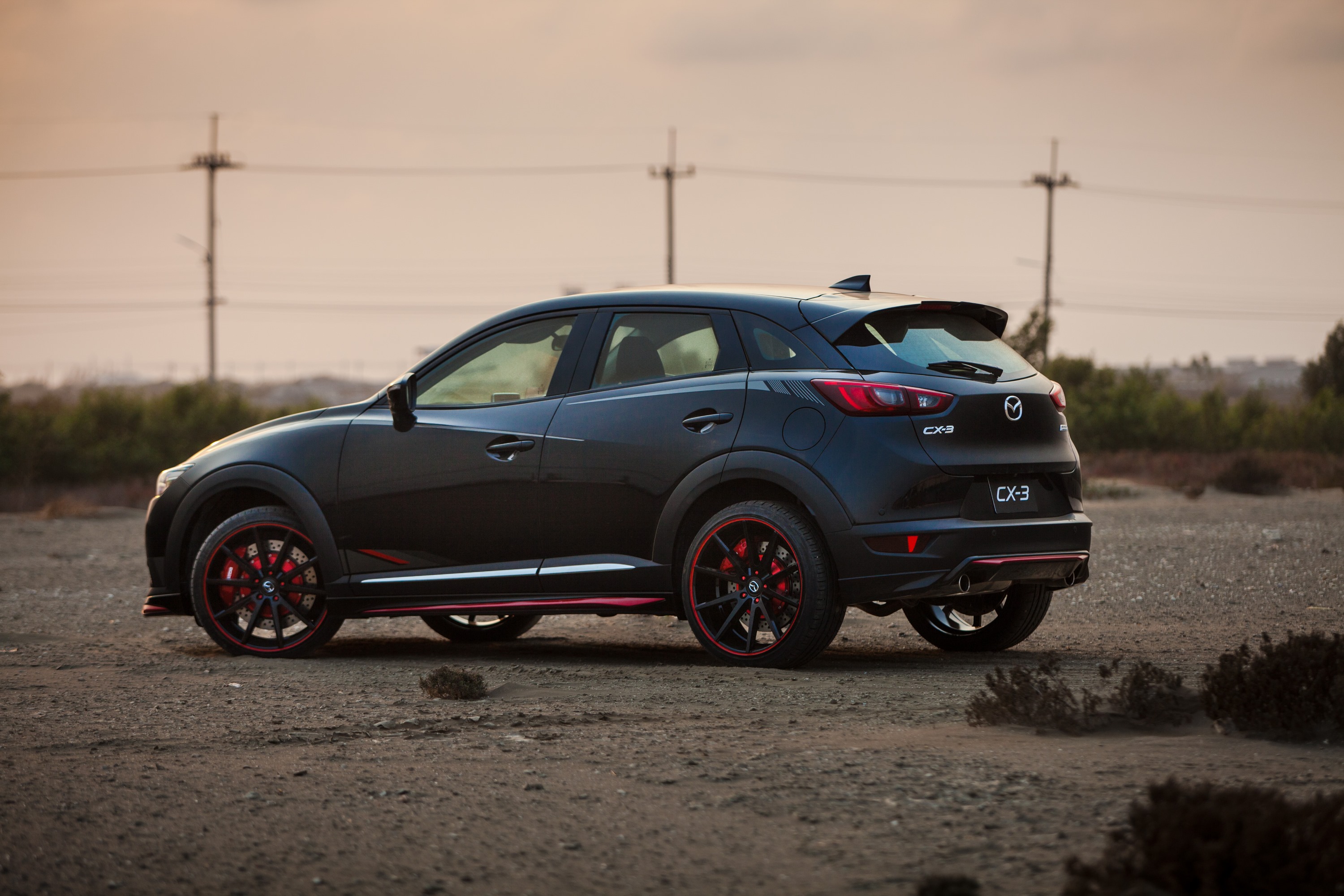 มาสด้า ซีเอ็กซ์-3 Sport Concept เน้นจิตวิญญาณแห่งความสปอร์ตในแบบฟรีสไตล์ครอสโอเวอร์ด้วยชุดแต่งดีไซน์เต็มพิกัดรอบคัน เพิ่มความโดดเด่นสไตล์สปอร์ตทั้งภายนอกและภายในอย่างอิสระไร้ขีดจำกัดกับชุดแต่งเสกิร์ตรอบคันจาก Mazdaspeed ยกระดับความสปอร์ตพรีเมียมไปอีกขั้นด้วยการตกแต่งกรอบหลังคาสีดำ เพิ่มความดุดันด้วยกรอบไฟตัดหมอกสีดำเงาและสติ๊กเกอร์ออกแบบมาโดยเฉพาะตกแต่งรอบคันในสไตล์สปอร์ต และโดดเด่นกว่าใครด้วยล้ออัลลอยด์สีดำเงาพิเศษขนาด 20 นิ้ว VSF1 พร้อมดุมล้อสีดำจาก Rays และยาง Toyo Extensa HP ขนาด 225/35 R20 (หน้า) และขนาด 245/35 R20 (หลัง)
