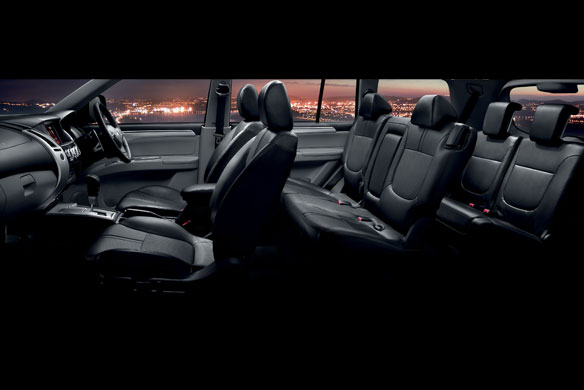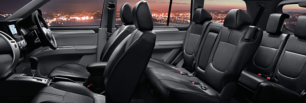 ภายในตกแต่งสีเงิน – โครเมียม ห้องโดยสารกว้างขวาง สัมผัสสบาย ตอบรับทุกอิริยาบถของการเดินทาง ระบบนำทางในรถยนต์ Bluetooth ระบบเชื่อมต่อโทรศัพท์แบบไร้สาย ระบบแสดงภาพจากกล้องมองหลัง ขณะถอยจอช่องเสียบชุดอุปกรณ์ต่อพ่วง iPod / USB จอภาพ LED ขนาดใหญ่ 10.2 นิ้ว ติดตั้งเหนือศรีษะ สำหรับผู้โดยสารตอนหลัง ให้ความเพลิดเพลินในการดูหนัง ฟังเพลง ตลอดการเดินทาง เบาะนั่งคู่หน้า สามารถปรับระดับด้วยไฟฟ้า 8 ทิศทาง รองรับสรีระอย่างลงตัว ช่องปรับอากาศที่นั่งแถว 2 และแถว 3 ให้ความเย็นสบายอย่างทั่วถึง ระบบควบคุมการเปลี่ยนเกียร์ที่พวงมาลัย (Paddle Shift) ให้ความสะดวกสบายในการเปลี่ยนเกียร์เพื่อการควบคุมที่ดีกว่า ระบบควบคุมความเร็วอัตโนมัติ (Cruise Control) ช่วยควบคุมความเร็วให้คงที่เพิ่มความสบาย ลดความเมื่อยล้าเมื่อต้องขับขี่ทางไกล สวิตซ์ควบคุมวิทยุที่พวงมาลัย (Steering Wheel Remote Control Switch) ให้คุณควบคุมระบบเสียงได้อย่างสะดวกสบายและปลอดภัย ปรับพับเบาะแถวที่ 2 และ 3 เพิ่มพื้นที่เพื่อประโยชน์ใช้สอยมากขึ้น เบาะแถวที่ 2 สามารถพับไปด้านหน้าแยกสวน แบบ 60 : 40 เพื่อให้คุณสามารถเพิ่มพื้นที่ในการบรรทุกสัมภาระได้มากขึ้น เบาะแถวที่ 3 สามารถปรับและพับแบบ 50 : 50 ให้ราบไปกับพื้นห้องโดยสาร เพื่อให้การเก็บสัมภาระด้านหลังรถเป็นไปได้อย่างสะดวกสบาย ช่องเก็บของด้านท้ายรถ หลังเบาะนั่งแถวที่ 3 พร้อมฝาปิดใช้เก็บอุปกรณ์และเครื่องต่างๆ เพิ่มความสะดวกสบายได้มากยิ่งขึ้น PERFOMANCE สมรรถนะ Pajero Sport ที่สุดแห่งสมรรถนะ และพลังขับเคลื่อนสมบูรณ์แบบ เครื่องยนต์เบนซิน 3.0 ลิตร V6 สูบ SOHC 24 วาล์ว 219 แรงม้าที่ 6,250 รอบต่อนาที แรงบิดสูงสุด 281 นิวตันเมตร ที่ 4,000 รอบต่อนาที พร้อมเทคโนโลยีอัจฉริยะของระบบวาล์วแปรผัน MIVEC ที่ควบคุมการเปิด-ปิดวาล์วไอดี เพื่อเพิ่มประสิทธิภาพให้กับเครื่องยนต์ในรอบสูง ตอบสนองอัตราเร่งที่ฉับไวและประหยัดน้ำมัน เมื่อใช้ความเร็วในรอบค่ำ