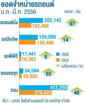 นายวุฒิกร สุริยะฉันทนานนท์ ผู้ช่วยกรรมการผู้จัดการใหญ่อาวุโส บริษัท โตโยต้า มอเตอร์ ประเทศไทย จำกัด เปิดเผยว่าตลาดรถยนต์เดือน มี.ค. สร้างสถิติสูงสุดด้วยยอดขาย 157,527 คัน เพิ่มขึ้น 41% เมื่อเทียบกับช่วงเดียวกันปีที่แล้ว โดยในจำนวนนี้รถยนต์นั่งมีอัตราการเติบโตสูงสุด 93% ด้วยยอด 78,816 คัน ขณะที่รถปิกอัพ มียอด 60,294 คัน เพิ่มขึ้น 8% "ตลาดเดือน มี.ค.ที่เติบโต ส่วนหนึ่งเป็นผลจากการทยอยส่งมอบรถในโครงการรถยนต์คันแรก เป็นปัจจัยบวกที่ช่วยกระตุ้นตลาด" เมื่อรวมยอดขายตลอดไตรมาสแรก (ม.ค.-มี.ค.) พบว่าตลาดรวมมีจำนวนทั้งสิ้น 413,256 คัน เพิ่มขึ้น 48% จากช่วงเดียวกันปีที่แล้ว ในจำนวนนี้รถยนต์นั่งมียอด 202,142 คัน เพิ่มขึ้น 97% ปิกอัพ 159,089 คัน เพิ่มขึ้น 14% เห็นได้ว่าช่วงไตรมาสแรก ตลาดรถยนต์นั่งมียอดจำหน่าย และสัดส่วนการเติบโตสูงกว่ารถปิกอัพอย่างชัดเจน จากปกติ ทั้ง 2 ตลาด จะมีขนาดที่ใกล้เคียงกัน ซึ่งเป็นผลจากการทยอยส่งมอบรถยนต์ในโครงการรถยนต์คันแรกซึ่งมีรถยนต์นั่งจำนวนมากกว่าปิกอัพ รวมไปถึงตั้งแต่ช่วงต้นปีที่ผ่านมา ค่ายรถเปิดตัวรถยนต์นั่งรุ่นใหม่ๆ เข้าสู่ตลาดจำนวนมาก นอกจากนี้การที่ยังเป็นผลมาจากช่วงไตรมาสแรกปีที่แล้ว ฮอนด้า ซึ่งเป็นค่ายรถที่มีบทบาทในตลาดรถยนต์นั่งอย่างมาก ประสบปัญหาโรงงานที่สวนอุตสาหกรรมโรจนะได้รับผลกระทบจากปัญหาน้ำท่วมใหญ่ปลายปี 2554 ทำให้ต้องหยุดสายการผลิตหลายเดือน ก่อนจะกลับมาเดินสายการผลิตได้อีกครั้งในวันที่ 31 มี.ค.2555 ทำให้ตลอดทั้งไตรมาสแรก ฮอนด้าไม่มีการผลิตรถ ต้องนำเข้ารถจากญี่ปุ่นที่ได้รับอนุมัติจากภาครัฐเข้ามาจำหน่ายในจำนวนจำกัดซึ่งจะเห็นได้ว่าตลอดไตรมาสแรกปีที่แล้ว ฮอนด้ามียอดจำหน่ายรถยนต์นั่ง 2,600 คัน แต่ช่วงเวลาเดียวกันปีนี้ ฮอนด้าทำได้ 62,229 คัน เพิ่มขึ้น 2,293% และสามารถครองตำแหน่งผู้นำตลาดในขณะนี้