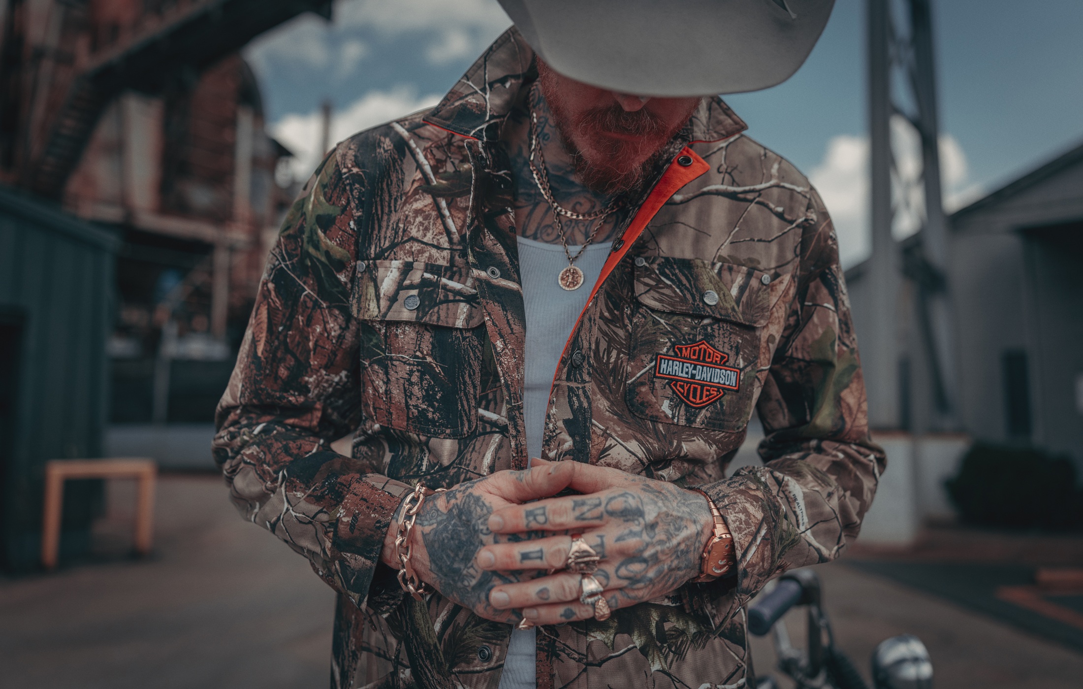 นับเป็นการจับมือกันของสองตำนานในแบบอเมริกันสไตล์ โดยคอลเลกชัน H-D® x Realtree® ได้เปลี่ยนเครื่องแต่งกายสำหรับขับขี่จากสไตล์คลาสสิกให้กลายเป็นเครื่องแต่งกายที่สะท้อนอิสระได้ทุกเมื่อที่ต้องการ และโดดเด่นสะดุดตาทุกครั้งเมื่อสวมใส่