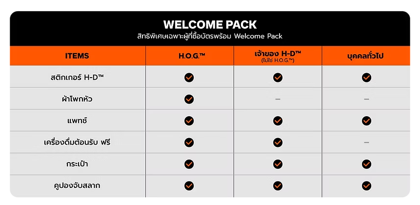 บัตรเข้างานพร้อมwelcome pack | 1,299 บาท | 1,499 บาท | 1,099 บาท | 1,299 บาท | ริสแบนด์, สิทธิ์โหวต Custom King, บัตรเล่นเกม, แพทซ์, สติกเกอร์ H-D, ผ้าโพกหัว, Welcome Drink,กระเป๋า, คูปองจับสลาก,และกิจกรรมที่น่าสนใจอื่นๆ |