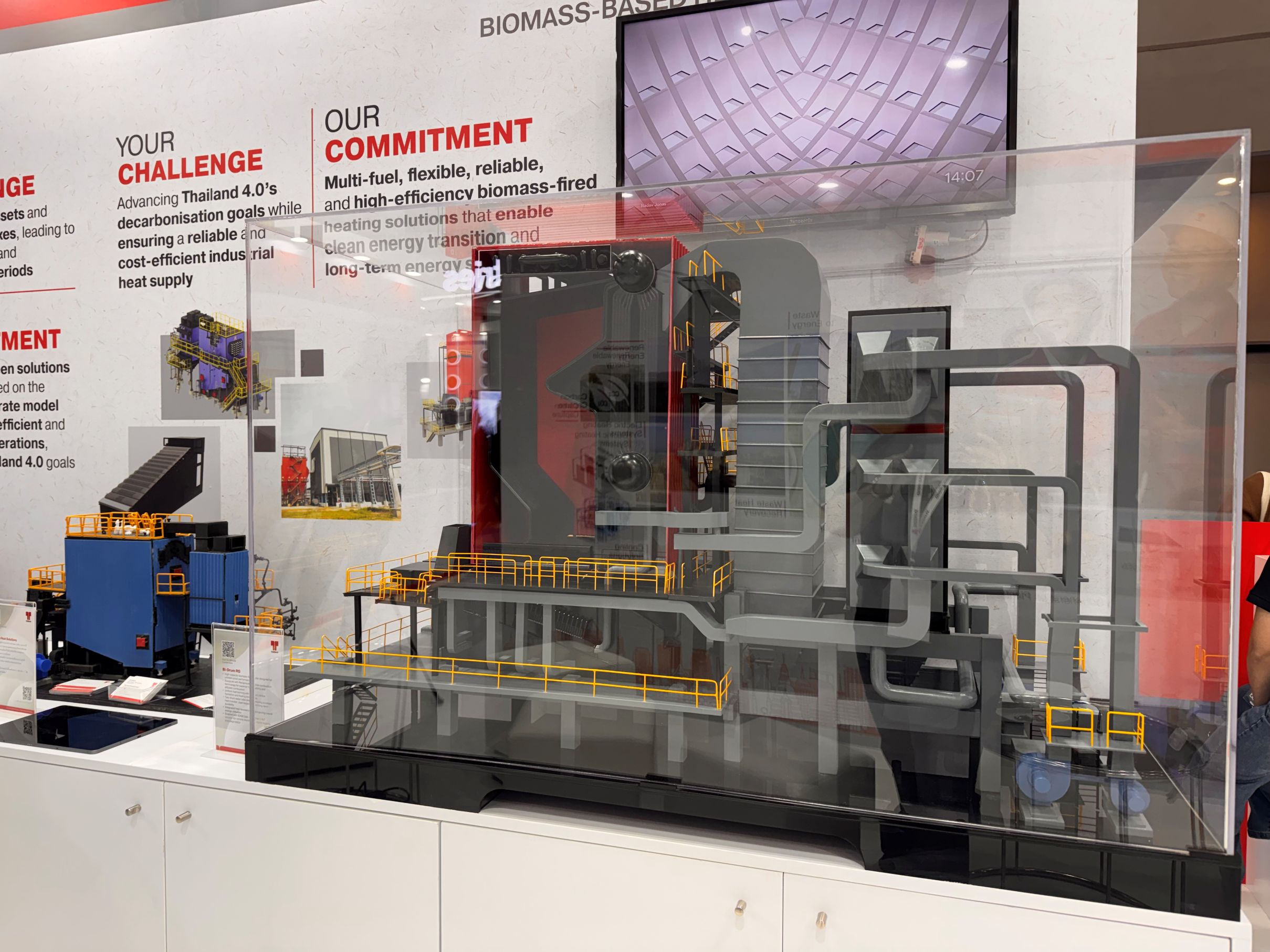 หนึ่งในไฮไลต์สำคัญของการจัดแสดงครั้งนี้คือโซลูชันระบบให้ความร้อนด้วยชีวมวลของ Thermax ซึ่งช่วยให้อุตสาหกรรมสามารถเปลี่ยนจากเชื้อเพลิงฟอสซิลแบบดั้งเดิมไปสู่พลังงานทดแทนที่สะอาดขึ้น ด้วยความสามารถในการเผาไหม้เชื้อเพลิงชีวมวลได้มากกว่า 150 ชนิด ผสานกับเทคโนโลยีตะแกรงสันเขย่านำสมัย (reciprocating grate) ทำให้ Thermax มอบความยืดหยุ่นและประสิทธิภาพที่เหนือกว่า โซลูชันเหล่านี้ให้สมรรถนะการทำงานที่เสถียร ประหยัดเชื้อเพลิง และคุ้มค่าระยะยาว ทำให้ชีวมวลเป็นทางเลือกที่ใช้งานได้จริงและขยายผลได้สำหรับการเปลี่ยนผ่านพลังงานภาคอุตสาหกรรมของไทย