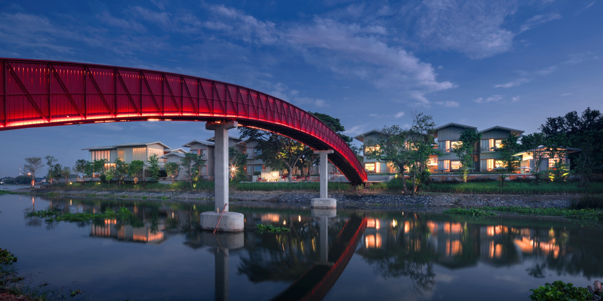 ผ่อนคลาย และเป็นกันเอง โดยตัวอาคารได้รับการออกแบบให้มีขนาดสอดคล้องกับบ้านเรือนโดยรอบ โอบล้อมด้วยต้นไม้เขียวขจี และต้นจามจุรีสูงใหญ่ที่ได้รับการอนุรักษ์ไว้เป็นอย่างดี ควบคู่กับการมอบความสะดวกสบายและฟังก์ชันการใช้งานที่ทันสมัยครบครัน แขกที่มาเยือนจะได้รับการต้อนรับบริเวณพื้นที่ล็อบบี้ที่โปร่งสบาย แต่งแต้มด้วยสีแดงอันสดใส ใต้อาคารไม้ยกพื้นสูง พร้อมด้วยแลนด์มาร์กสำคัญที่กลายเป็นสัญลักษณ์ประจำบูติกรีสอร์ทแห่งนี้ คือสะพานสีแดงทอดข้ามแม่น้ำ ที่มีสีสันโดดเด่น แต่ก็กลมกลืนไปกับบริบทของหมู่บ้าน ทำหน้าที่เชื่อมพื้นที่สองฝั่ง และแฝงถึงการเชื่อมโยงระหว่างสถาปัตยกรรมสมัยใหม่กับวิถีชุมชนท้องถิ่นริมฝั่งน้ำได้เป็นอย่างดี