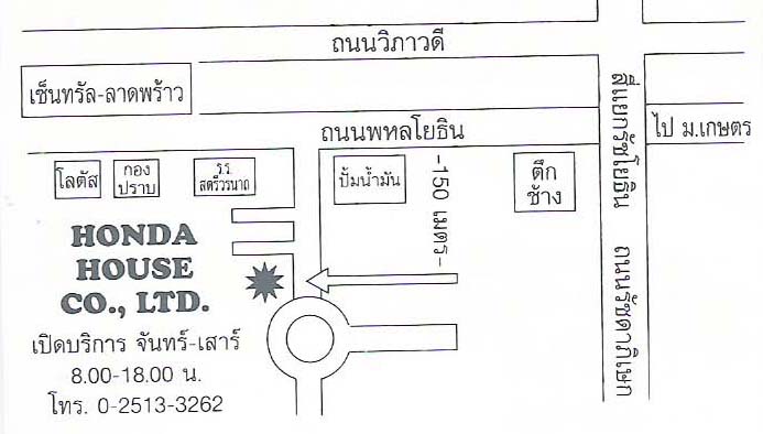 บริษัท ฮอนด้า เฮ้าส์ จำกัด HONDA HOUSE CO.,LTD. 246 ซอยพหลโยธิน 24 ถนนพหลโยธิน แขวงจอมพล เขตจตุจักร กรุงเทพฯ 10900 โทร 084-755-2819 , 0-2513-3262 , 0-2939-7502 Fax : 0-2939-7502